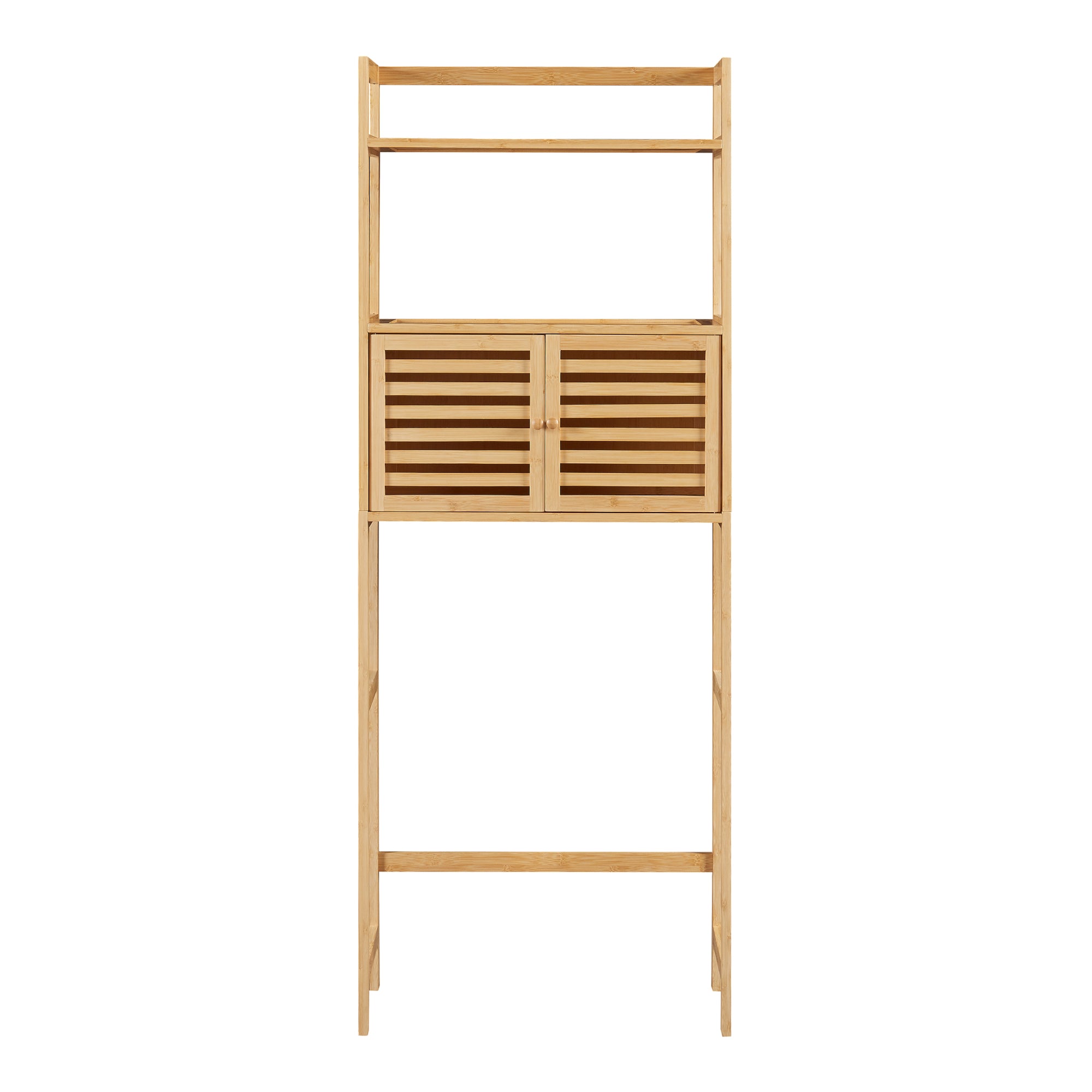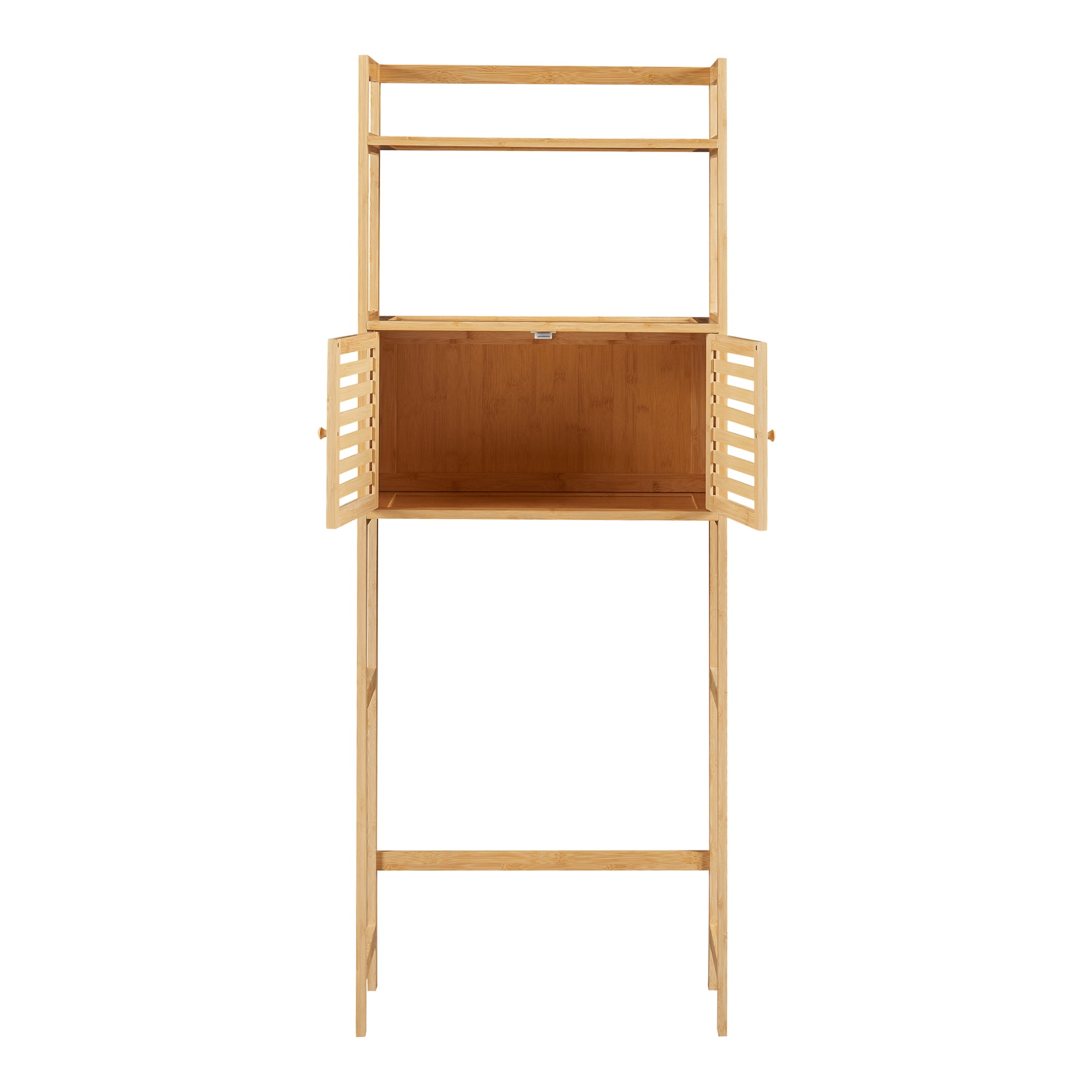 Dieses Regal ist mit einem geräumigen Schrank ausgestattet, der über zwei Türen verfügt. Im Inneren finden Sie ausreichend Stauraum, um all Ihre Parfüms, Kosmetikprodukte und sonstigen Badezimmerutensilien ordentlich und griffbereit aufzubewahren.