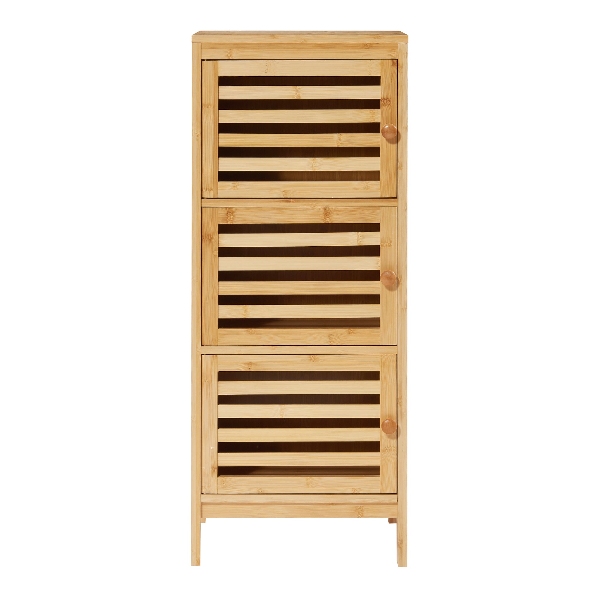 Die drei Innenfächer sind separat zugänglich, bieten großzügigen Stauraum und ermöglichen eine übersichtliche Organisation Ihrer Habseligkeiten. Die lamellenartigen Türen sorgen für eine optimale Luftzirkulation, wodurch der Inhalt stets gut belüftet bleibt. Durch die praktischen Griffe lassen sie sich zudem mühelos öffnen.