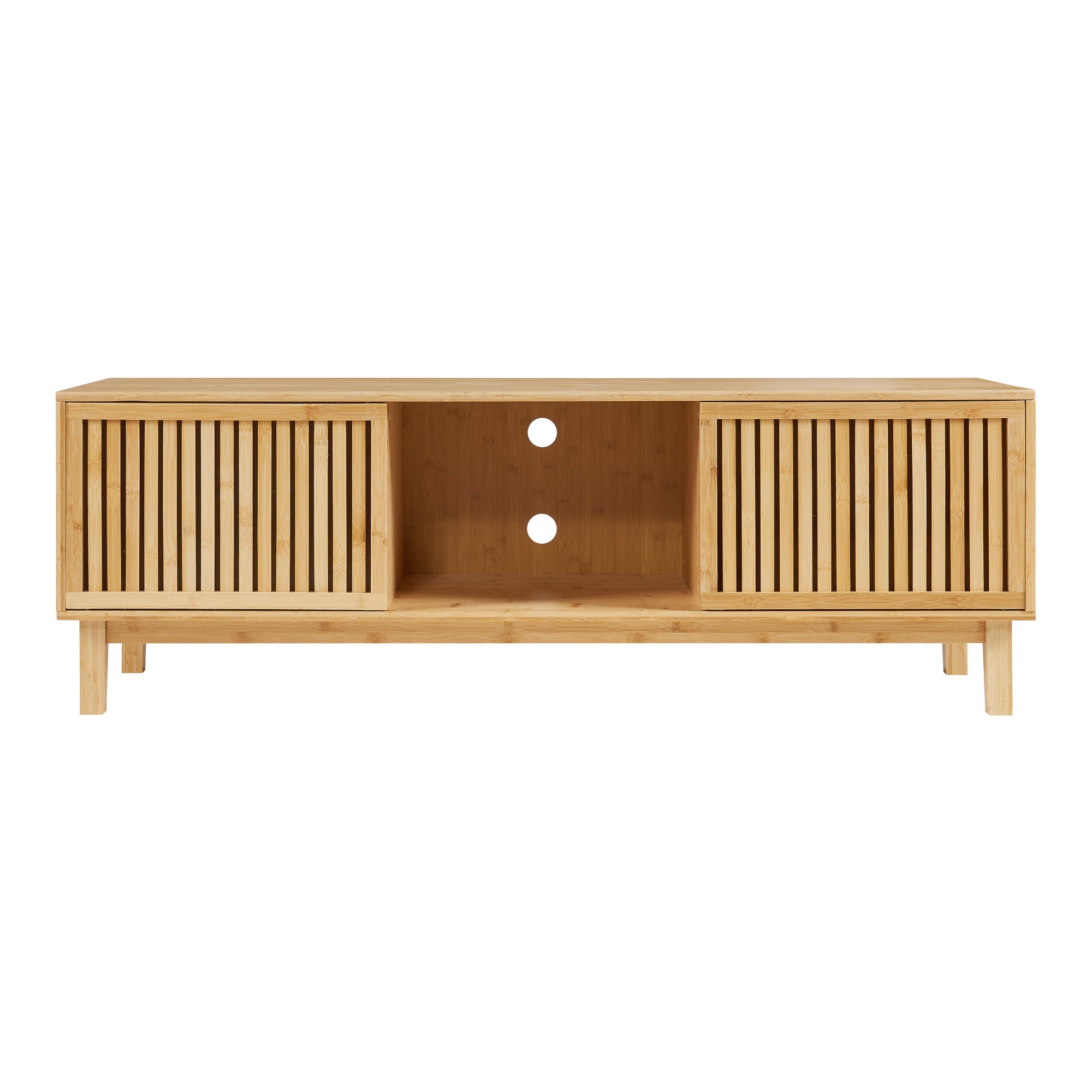 Die großzügige Oberfläche des Fernsehschranks bietet ausreichend Platz für Ihren Fernseher. Darunter befinden sich drei praktische Ablagefächer mit zwei Schiebetüren, die ideal sind für die Aufbewahrung von Mediengeräten wie DVD-Playern oder Spielekonsolen. Das mittlere Fach verfügt über zwei Kabeldurchlässe, die eine ordentliche Kabelführung ermöglichen. Dies trägt nicht nur zu einem aufgeräumten Erscheinungsbild bei, sondern sorgt auch dafür, dass alle wichtigen Geräte und Zubehörteile stets zur Hand sind.