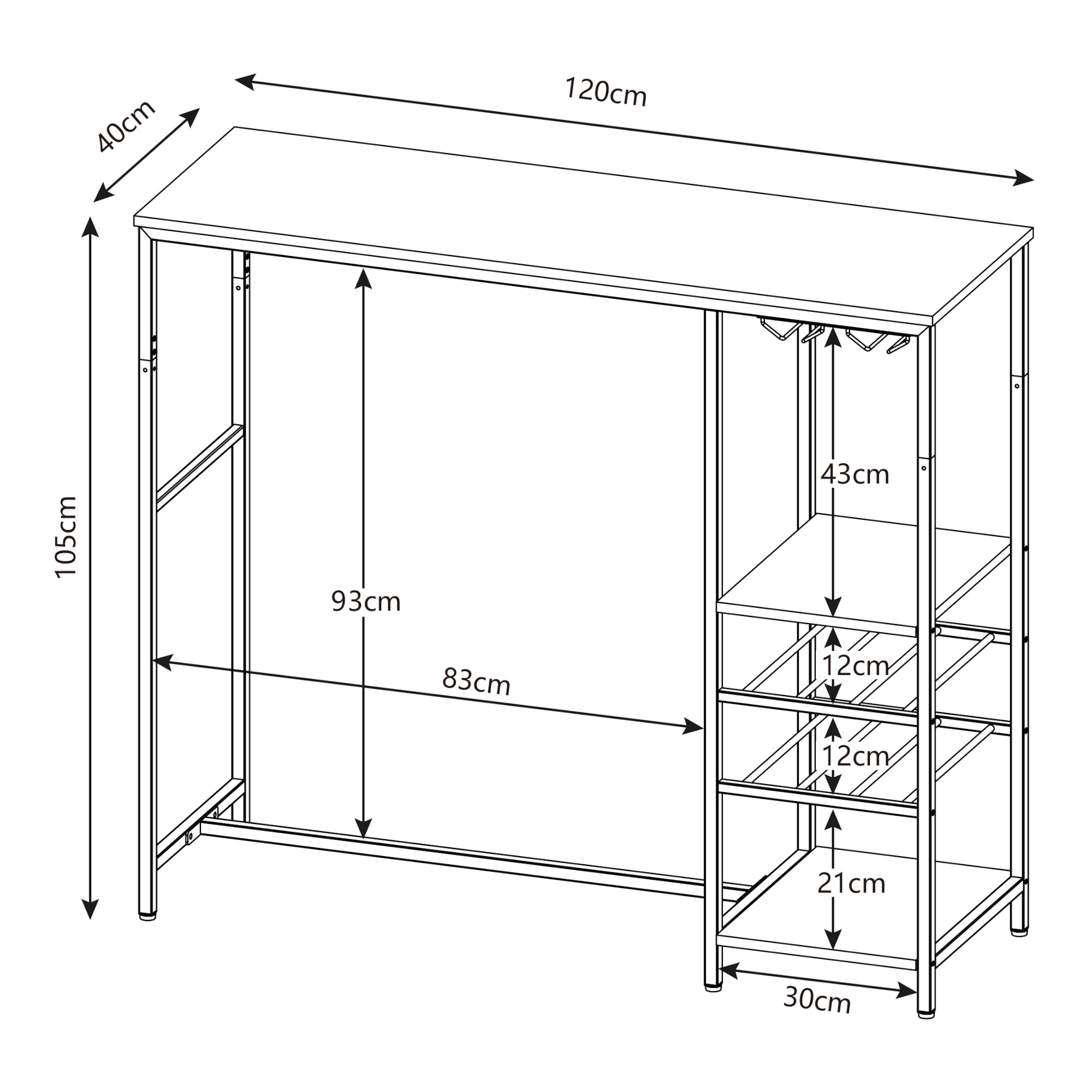 Das seitliche Regal verfügt über insgesamt vier Ablagen. Die obere und untere dienen als klassische Ablageflächen für verschiedene Gegenstände oder Dekorationen, während die beiden mittleren Flaschenablagen speziell dafür konzipiert sind, Weinflaschen sicher und stilvoll zu lagern. Über den Ablagen befindet sich ein integrierter Gläserhalter, der optimal für Weingläser genutzt werden kann.