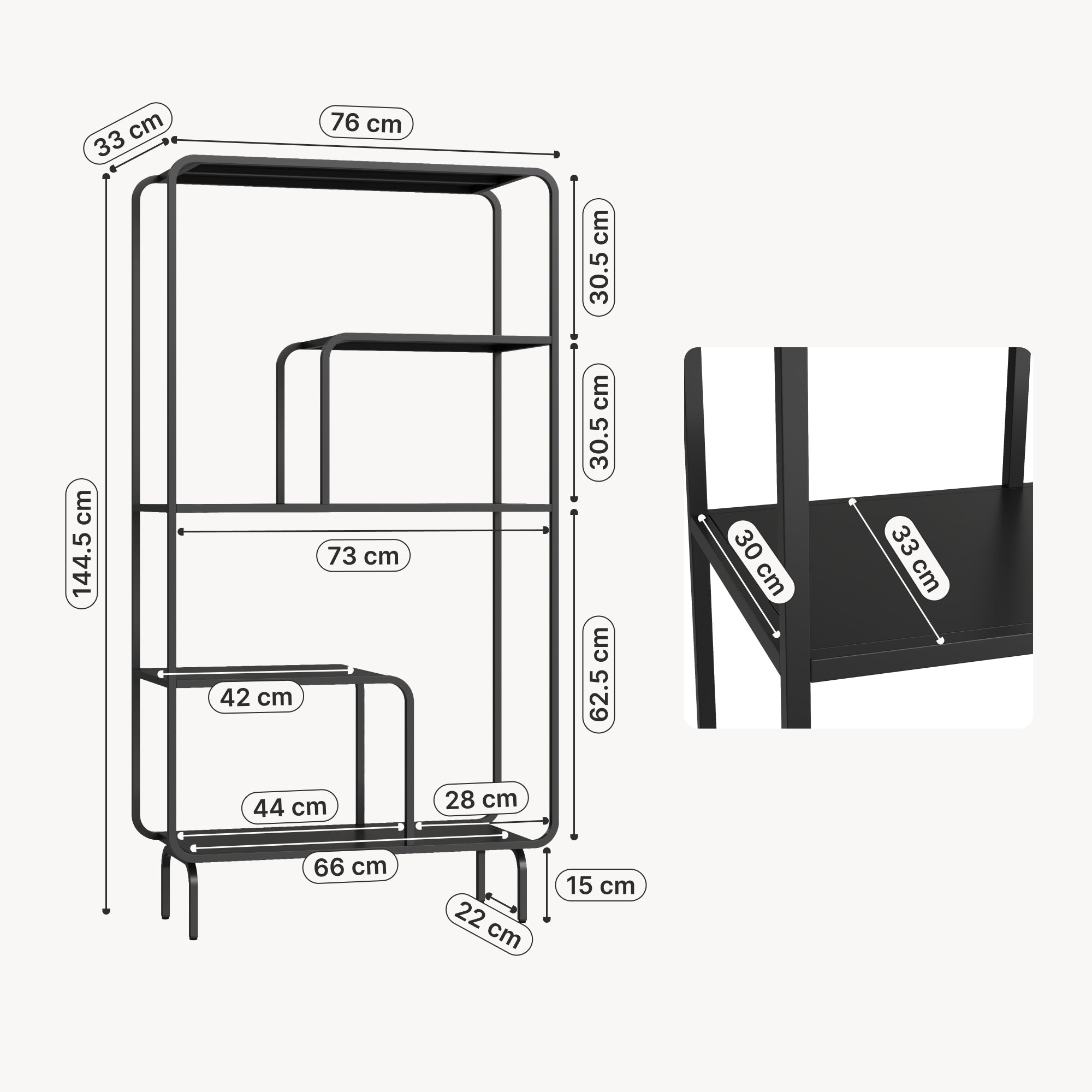 Die vier offenen Regalfächer des Standregals bieten ausreichend Platz zum Verstauen von Büchern, Pflanzen und anderen persönlichen Schätzen. Sie teilen sich in zwei große L-förmige und zwei kleine rechteckige Fächer auf. Durch diese offene Gestaltung sind Ihre Lieblingsgegenstände stets griffbereit und gleichzeitig ansprechend präsentiert.