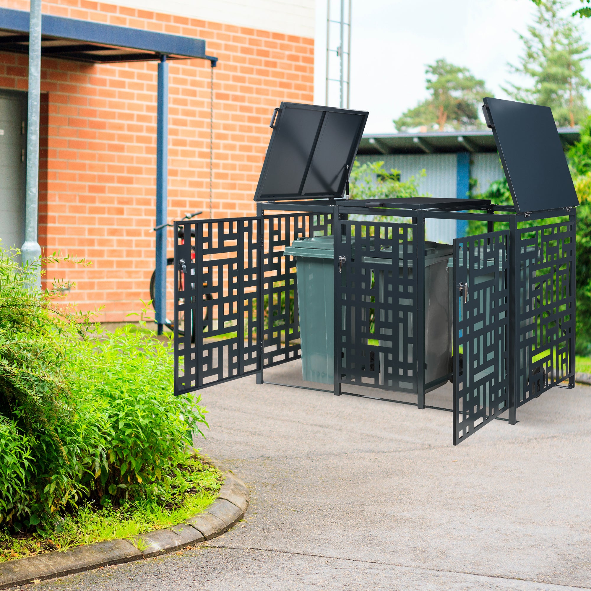 Die Mülltonnenbox ist mit abschließbaren Türen ausgestattet, die für Sicherheit sorgt. Der praktische Handgriff an der Tür erleichtert das Öffnen und Schließen, während die mitgelieferten Schlüssel sicherstellen, dass nur berechtigte Personen Zugang haben.