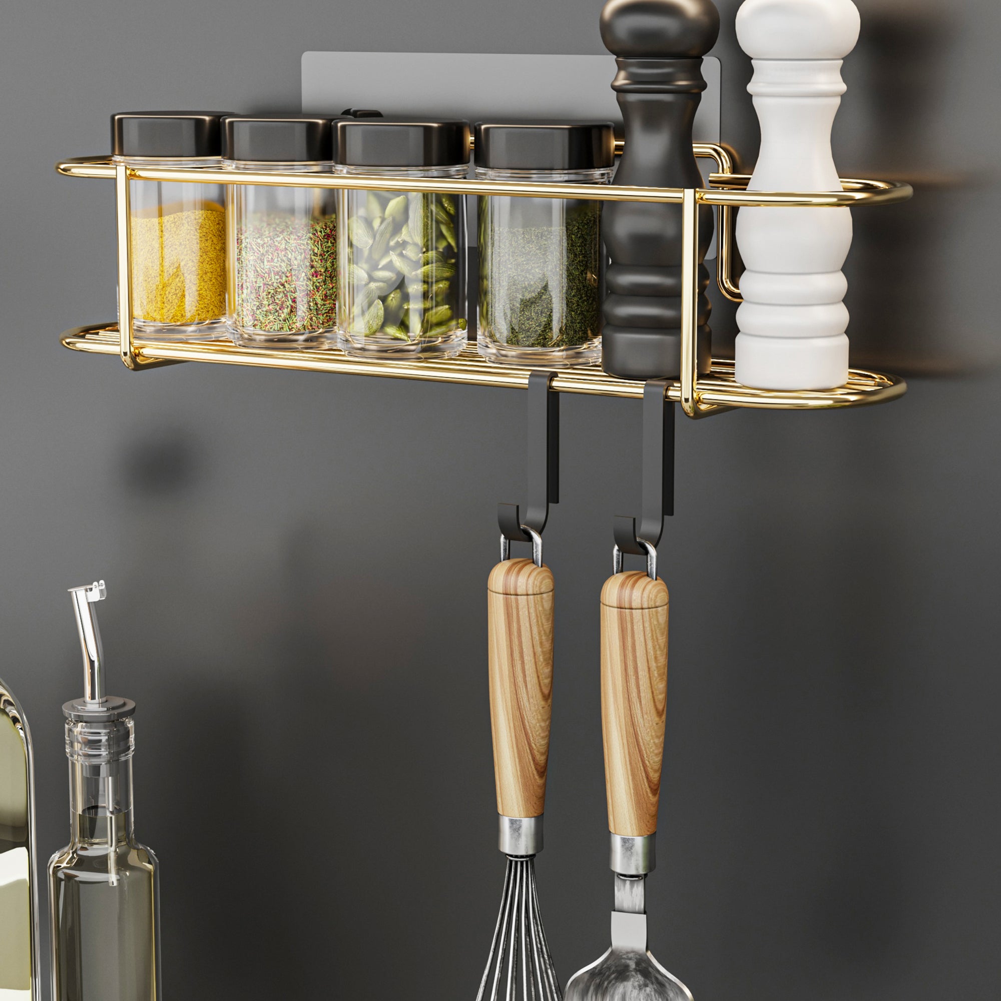 Dieses elegante Gewürzregal ist eine ideale Ergänzung für Ihre Küche. Es bietet perfekten Stauraum für Gewürze und Kochutensilien.