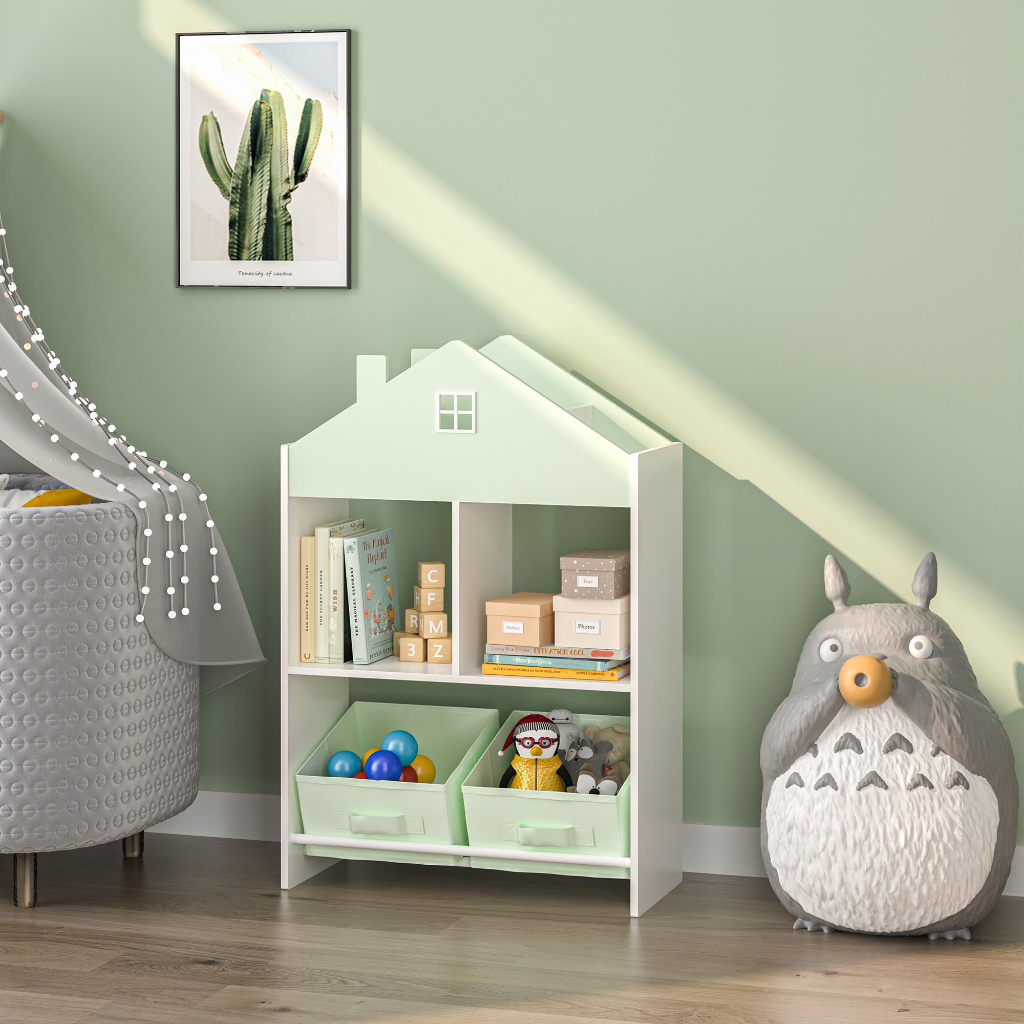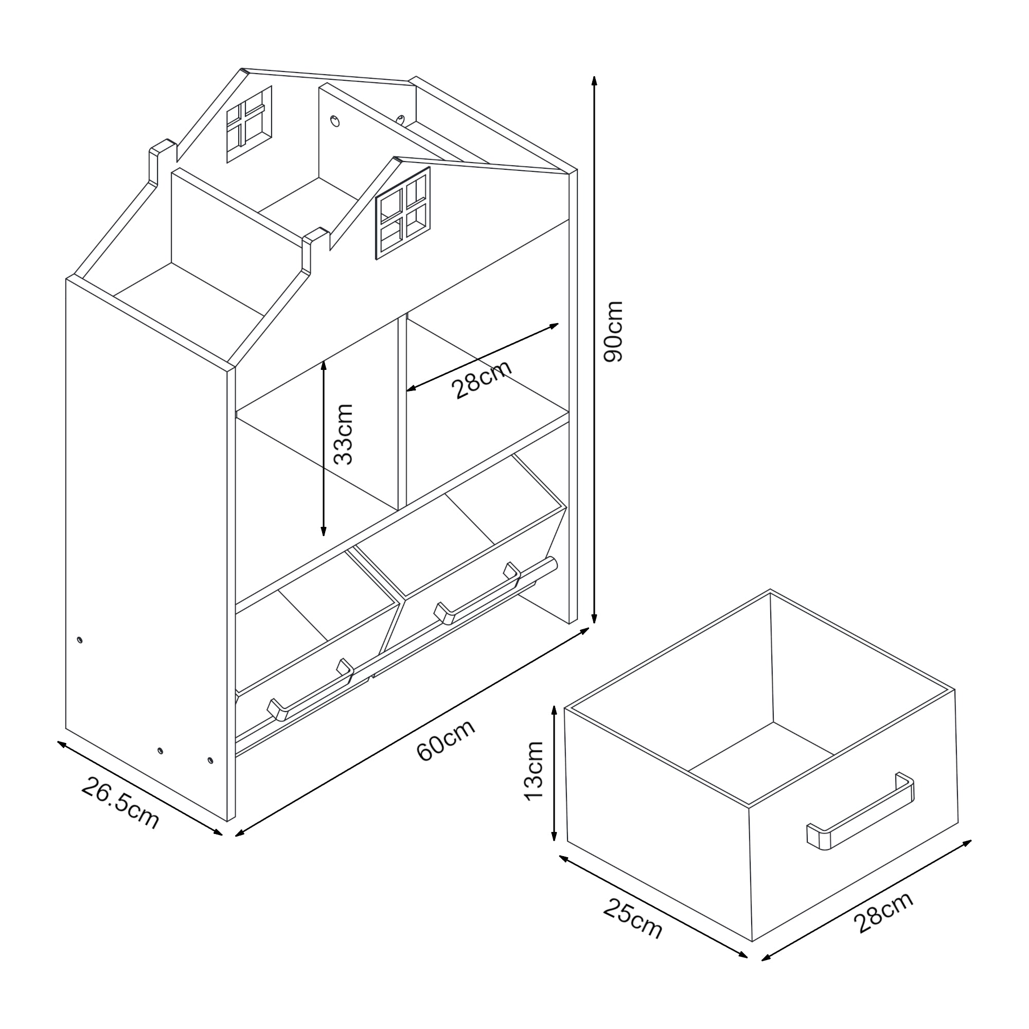 Das Kinderregal bietet mit zwei offenen Ablagefächern in der Mitte, drei weiteren Fächern im Dachbereich, sowie zwei Aufbewahrungsboxen reichlich Platz für die Schätze Ihres Kindes. Die dekorative Hausoptik macht es zu einem echten Hingucker in jedem Kinderzimmer.