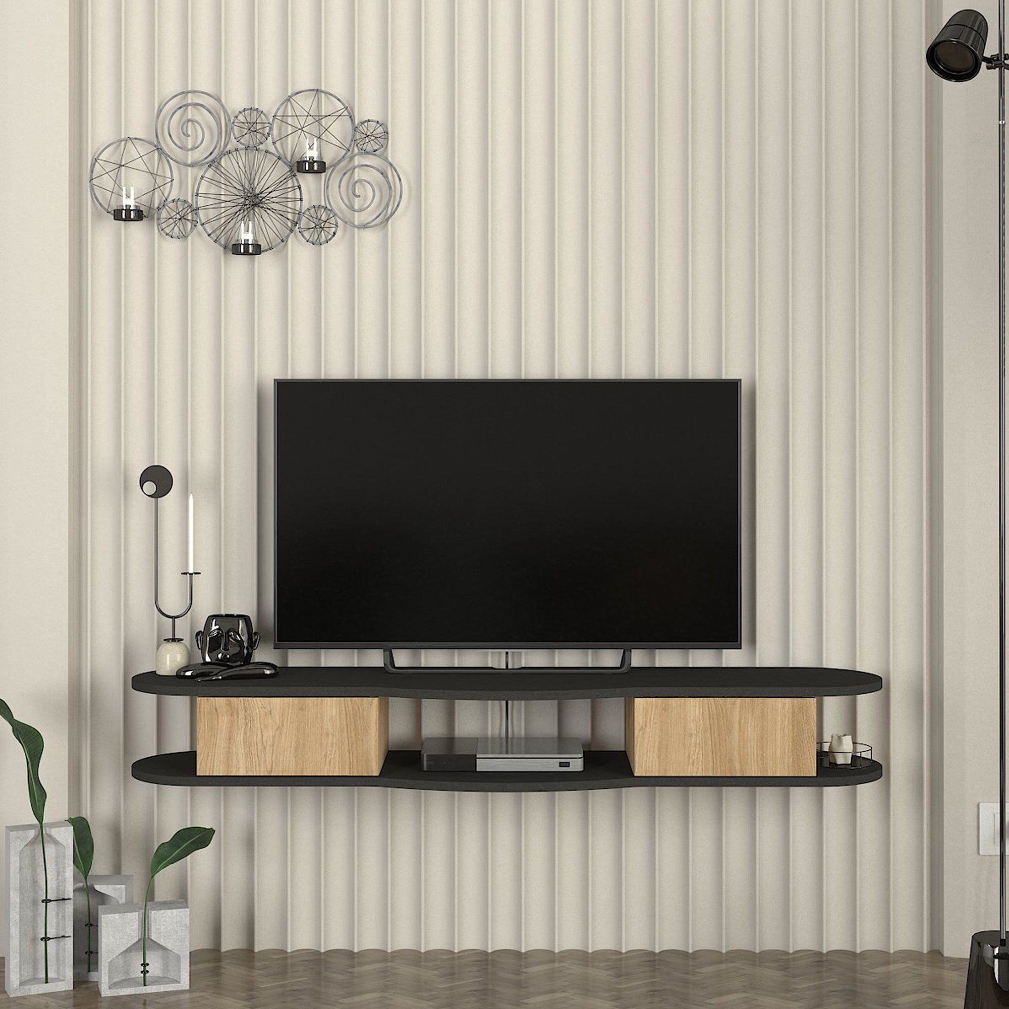 Das schwebende TV-Board eignet sich ideal, um Ihren Fernseher und alle damit verbundenen Geräte strukturiert und übersichtlich zu platzieren. Dank des zeitlosen Designs fügt es sich harmonisch in verschiedenste Wohnkonzepte ein.