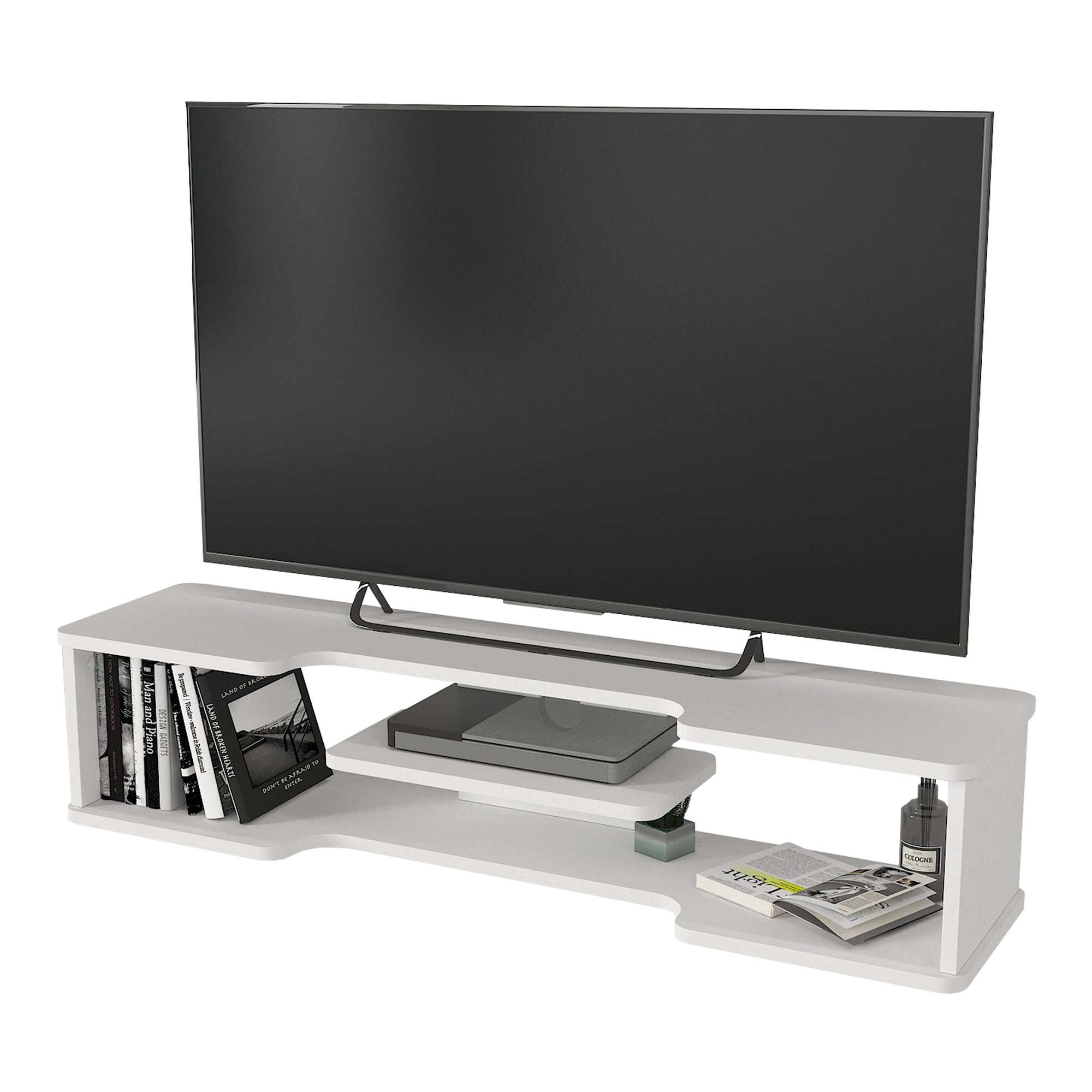 Das moderne TV-Regal lässt sich einfach und unkompliziert aufbauen und an der Wand montieren. Es verfügt über mehrere praktische Ablagemöglichkeiten und ist eine elegante Ergänzung für Ihr Wohnzimmer oder Ihre Unterhaltungsecke.
