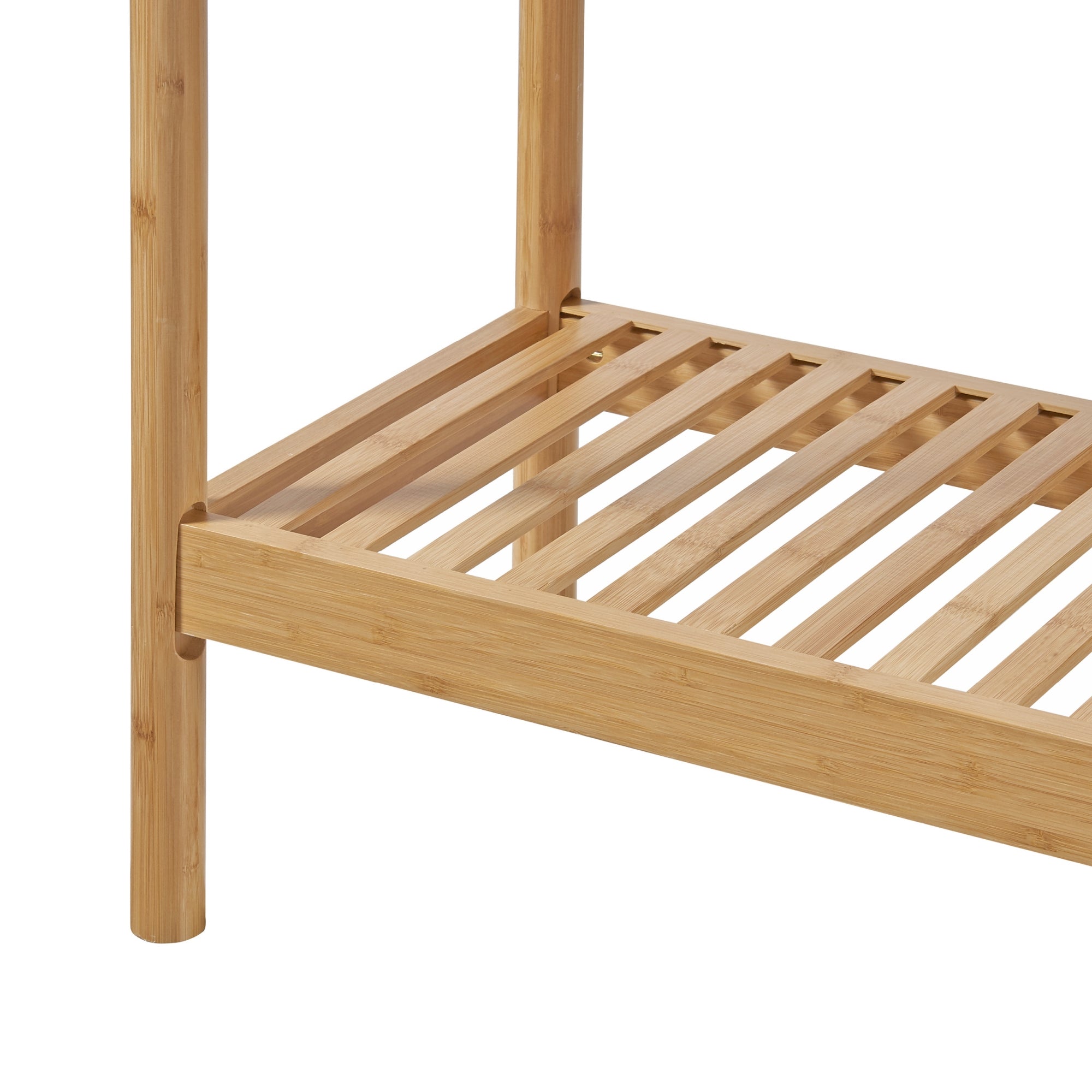 Der praktische und stilvolle Kleiderständer lässt sich schnell und einfach aufbauen. Er verfügt über eine Garderobenstange ein zusätzliches Ablagefach unter dem Hängebereich und eine untere Ablagefläche.