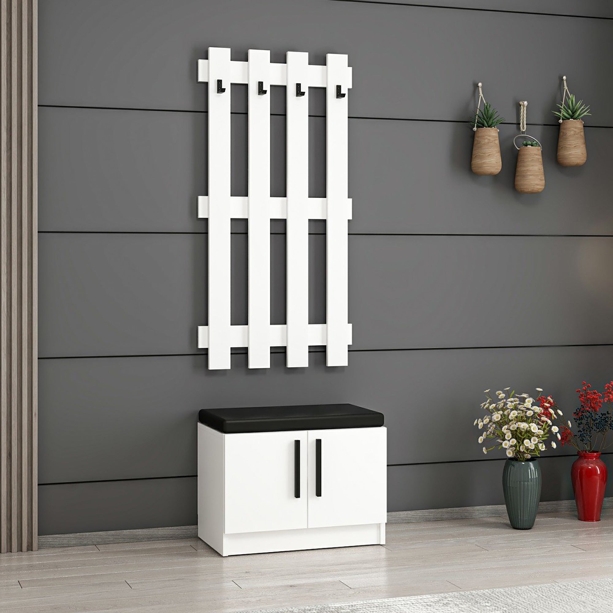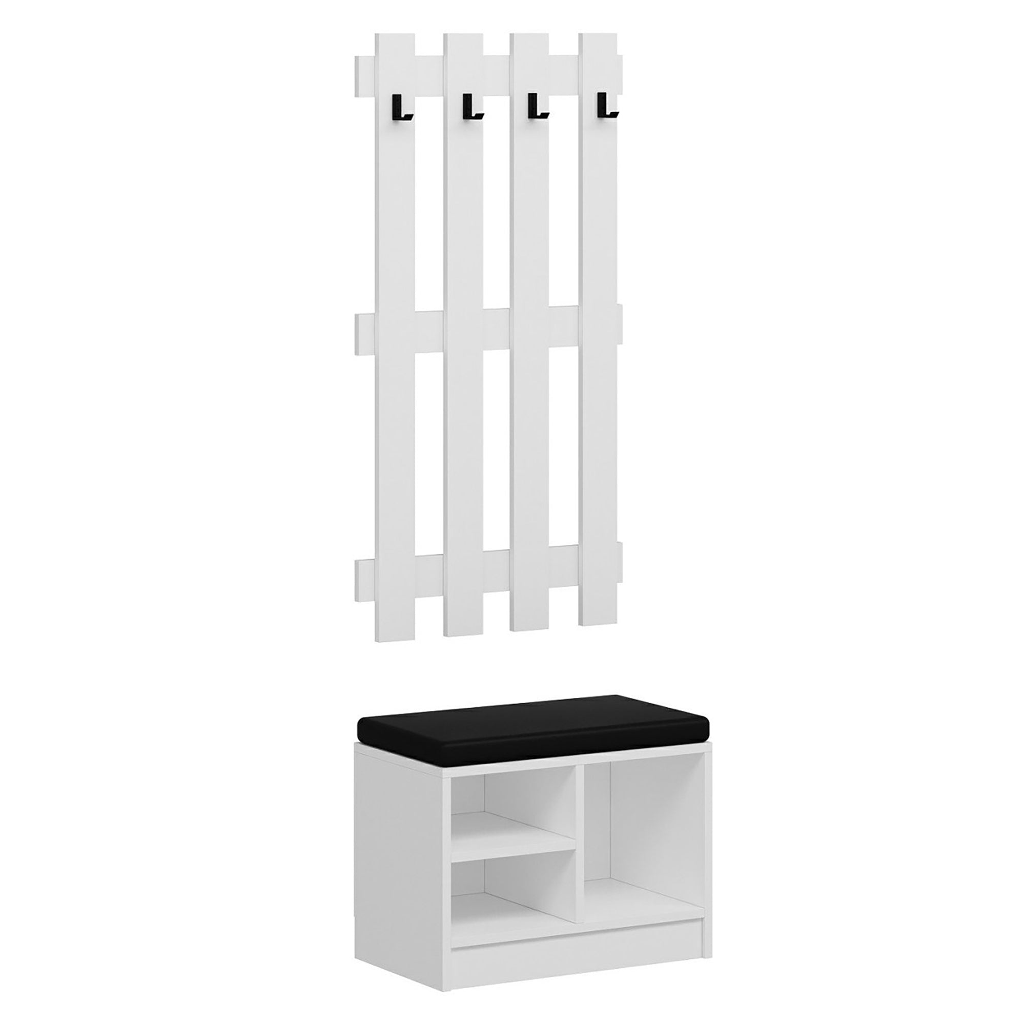 Die Wandgarderobe mit 4 Kleiderhaken eignet sich perfekt für jeden Hausflur. Die dazugehörige Schuhbank verfügt über 2 Türen und bietet den idealen Stauraum für Ihre Schuhe.