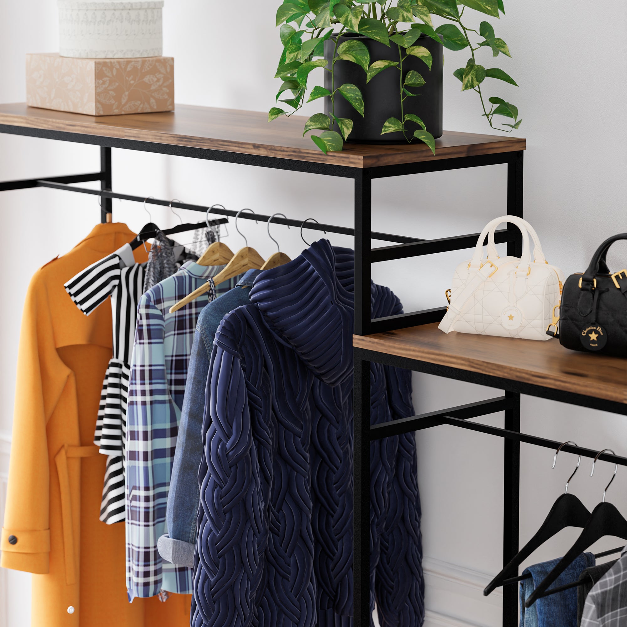 Die Kleiderstangen schaffen ausreichend Platz für Jacken, Mäntel, Schals und mehr. Die Ablageflächen über dem Hängebereich sorgen für zusätzlichen Stauraum, ideal für Hüte, Taschen oder Aufbewahrungsboxen.