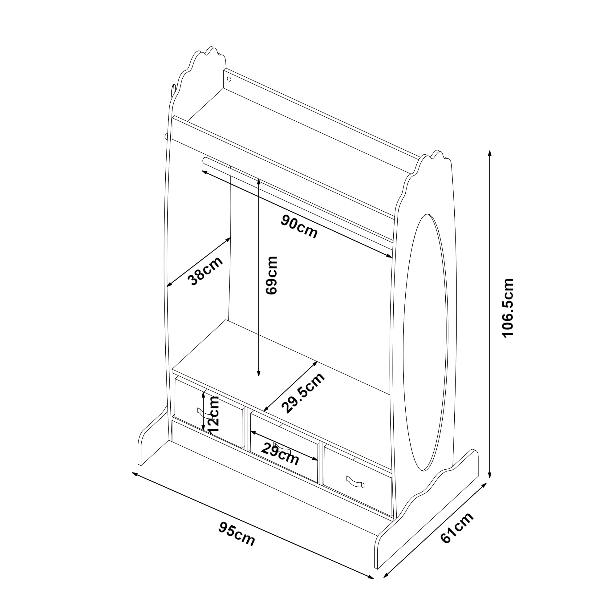 An der Seite befindet sich ein praktischer Kleiderhaken, ideal zum Aufhängen von Taschen oder Jacken. Auf der gegenüberliegenden Seite ist ein ovaler Spiegel angebracht, der den Kleinen dabei hilft, sich selbst zu betrachten und ihr Outfit auszuwählen.