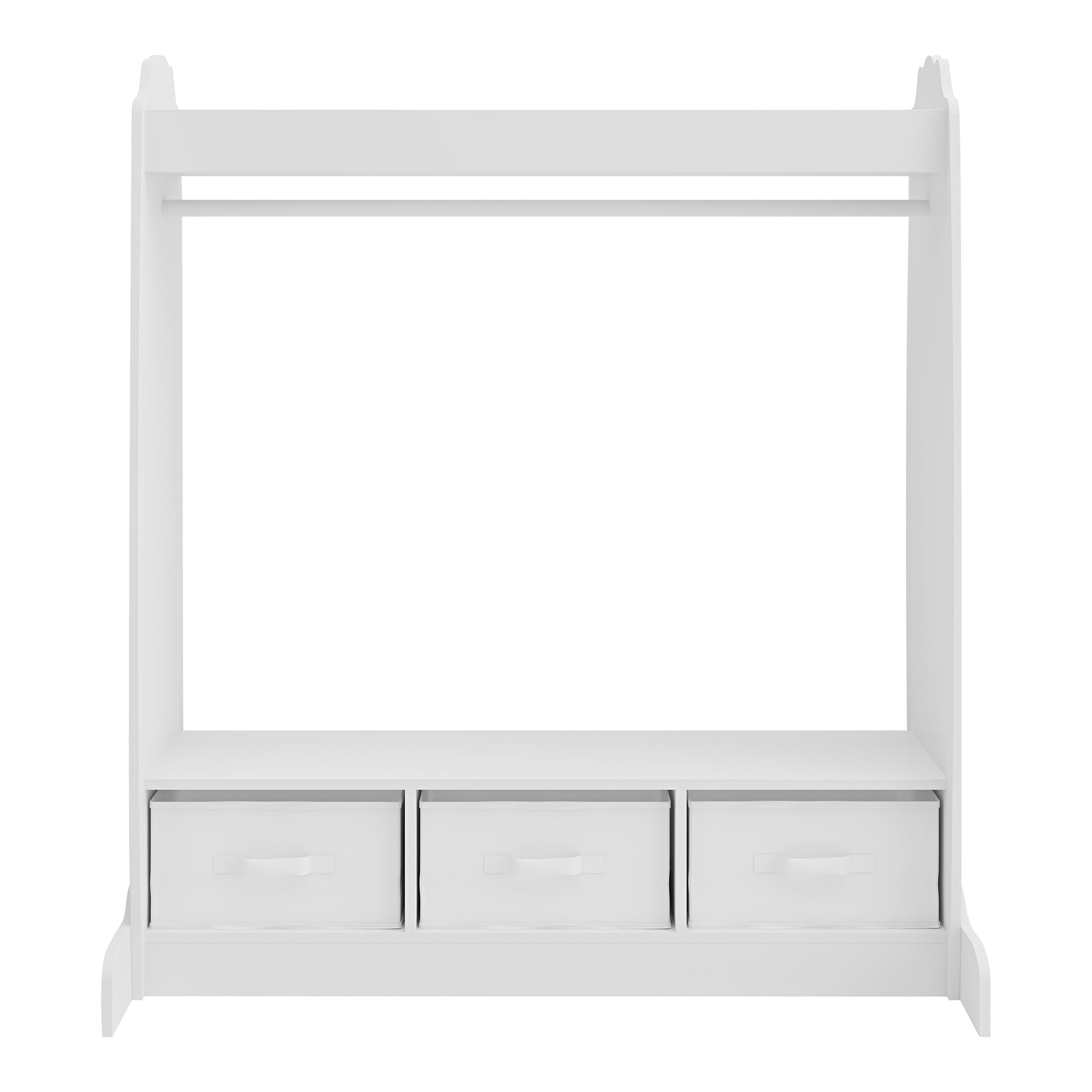 Die Kindergarderobe verfügt über eine großzügige Kleiderstange und drei untere Schubladen, die aus herausnehmbaren Faltboxen bestehen. Diese Boxen bieten zusätzlichen Stauraum für Kleidung, Spielzeug oder andere Accessoires und können flexibel genutzt werden.