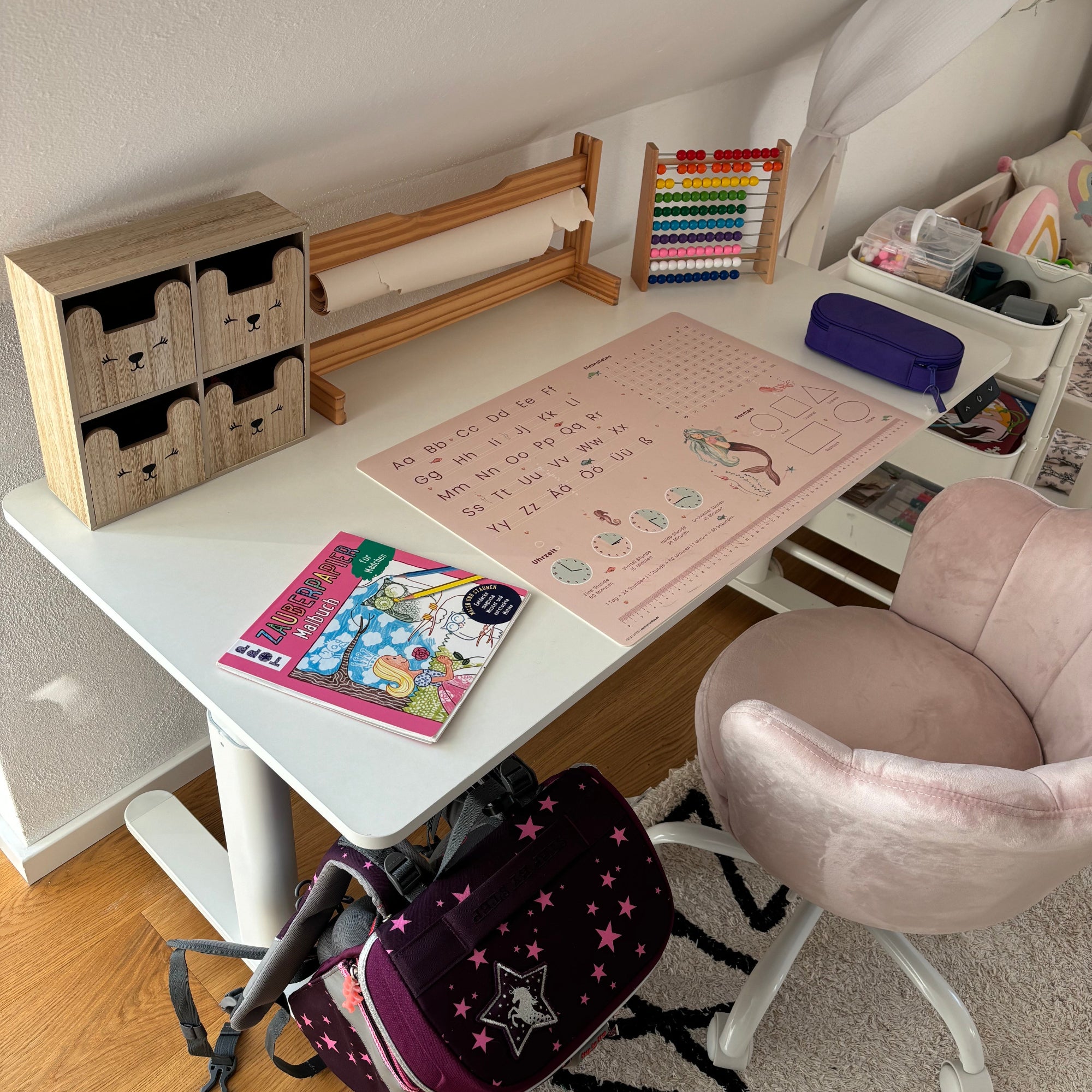 Mit den Tischfüßen lassen sich kleine Bodenunebenheiten ausgleichen. Dadurch steht der Schreibtisch stabiler und wackelt weniger – ein großer Vorteil beim Schreiben, Malen oder Arbeiten am Laptop.