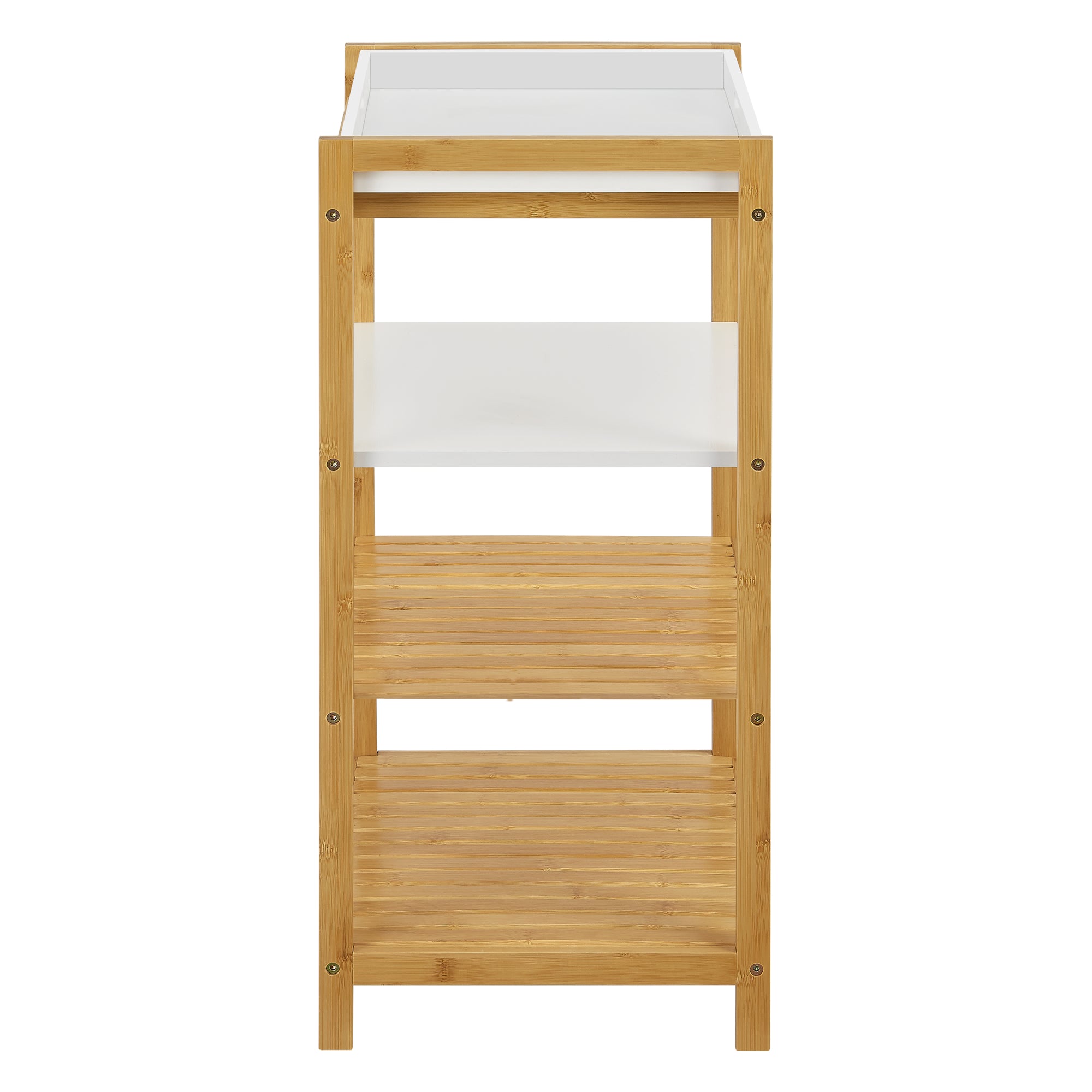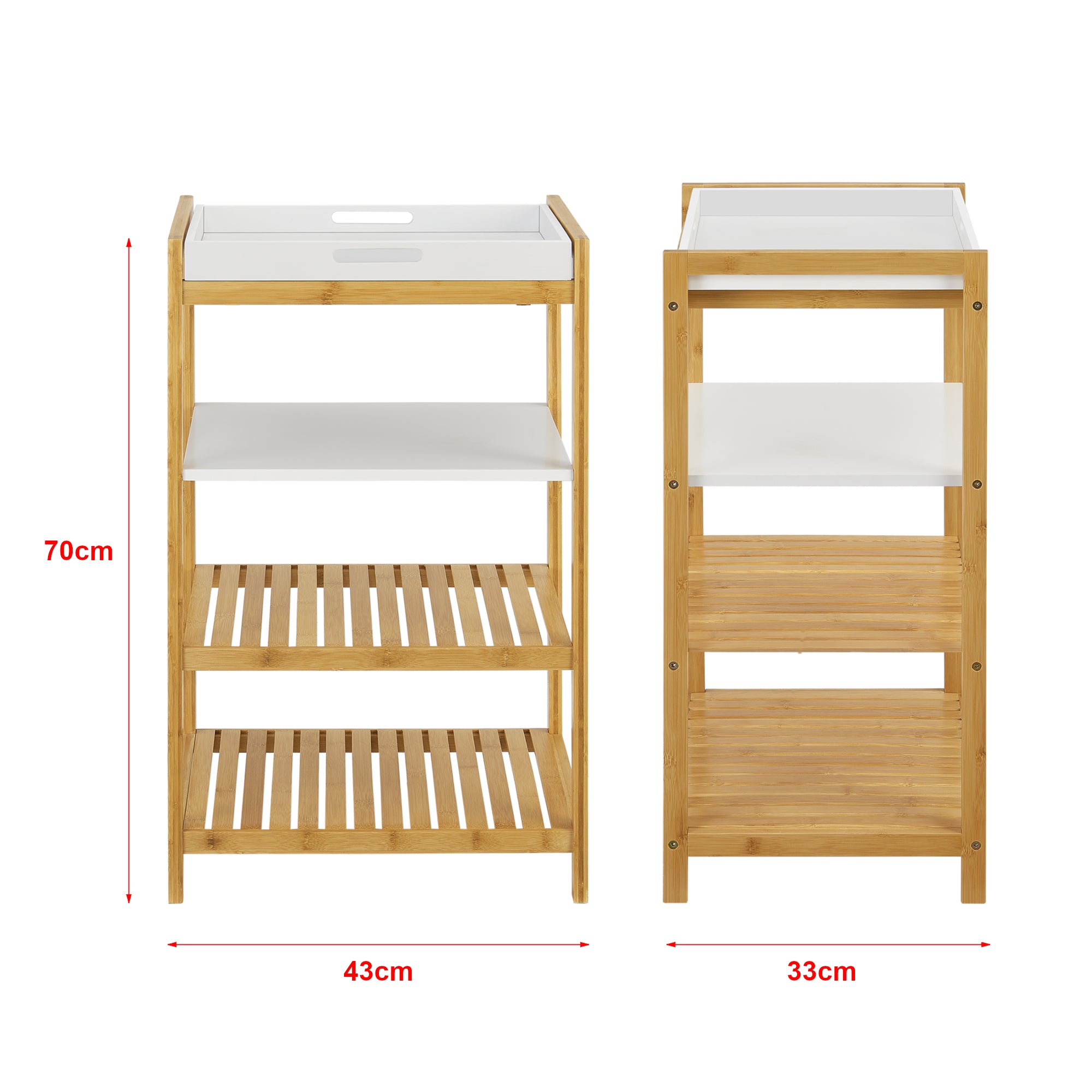 Das freistehende und praktische Standregal ist ideal für Ihren Wohnbereich. Egal ob im Badezimmer, in der Küche oder im Wohnzimmer, es ist überall einsetzbar. Die unteren Ablagen bieten Ihnen die Möglichkeit sämtliche Gegenstände platzsparend abzustellen. Außerdem verfügt es über eine zusätzliche Tablettablage, welche abnehmbar ist und sich bspw. ideal zum Servieren von Snacks oder Gerichten eignet.