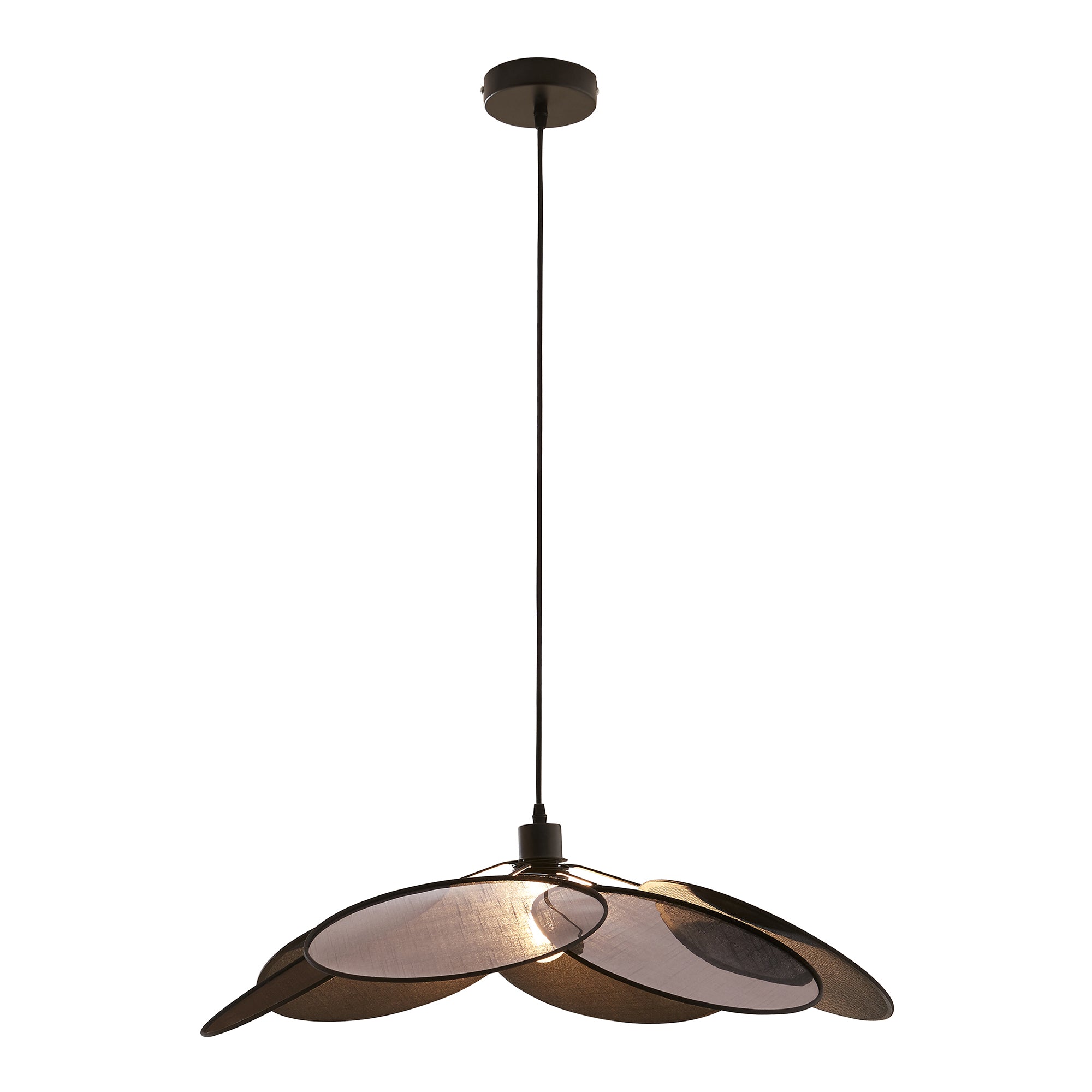 Die Pendelleuchte besteht aus mehreren großen, rund angeordneten Textilschirmen, die sich überlappend zu einem dekorativen, blütenartigen Gesamtbild fügen. Die zentrale Lampenfassung hält das Leuchtmittel sicher an seinem Platz und garantiert eine zuverlässige Funktion.