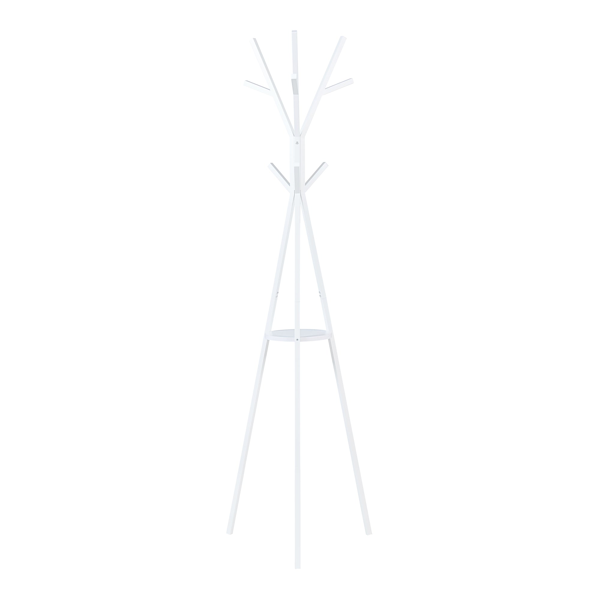 Der Kleiderständer besticht durch die elegante Ast-Struktur der Haken, die eine übersichtliche Aufhängung von Kleidungsstücken ermöglicht. Eine runde Ablage in der Mitte des Ständers schafft zusätzlichen Stauraum für Dekorationen, Accessoires und andere Kleinigkeiten.