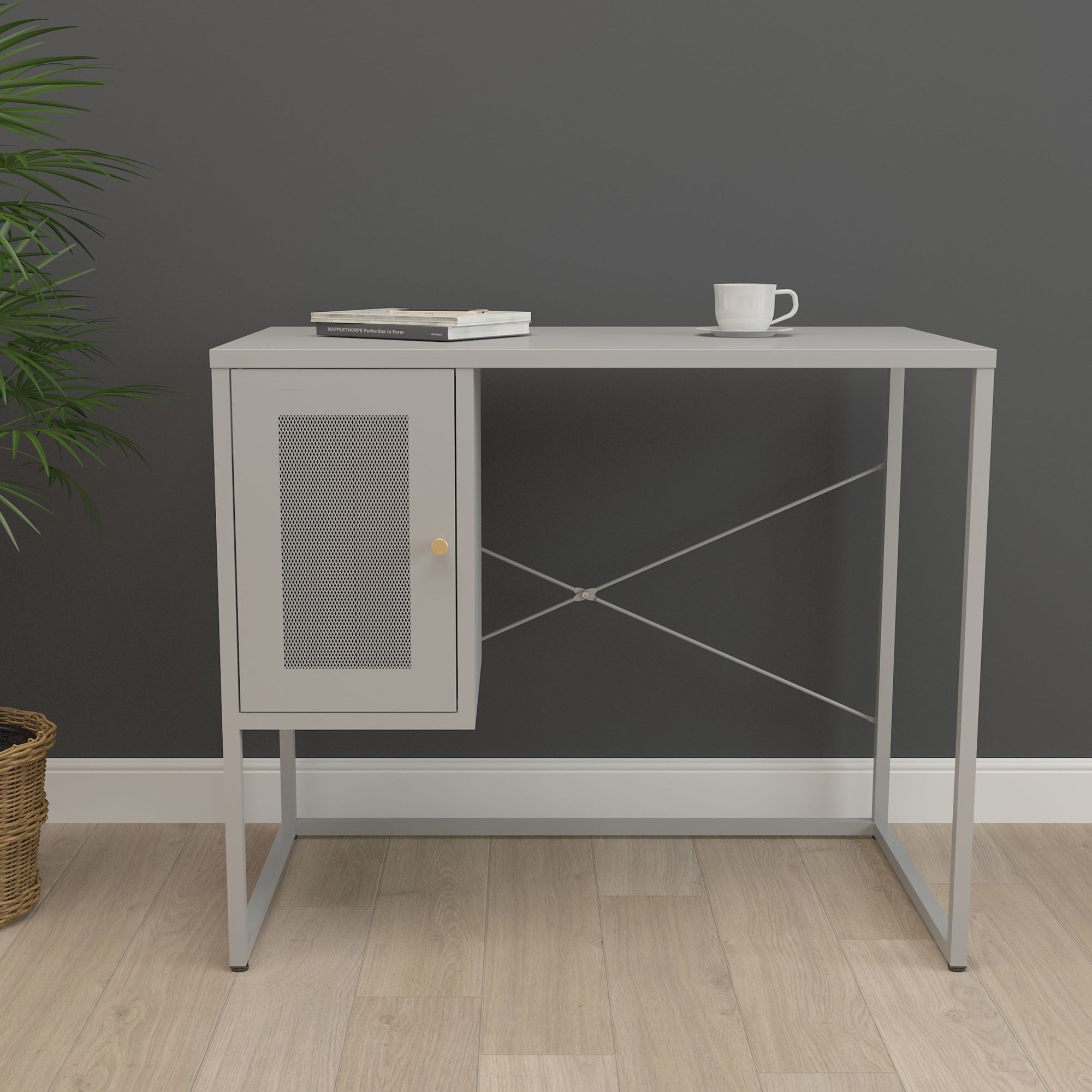 Ein besonderes Merkmal des Schreibtisches ist das seitlich integrierte Ablagefach. Es verfügt über eine feinmaschige Gittertür mit Türgriff und bietet eine praktische Möglichkeit, Bücher sowie andere Gegenstände platzsparend zu verstauen.