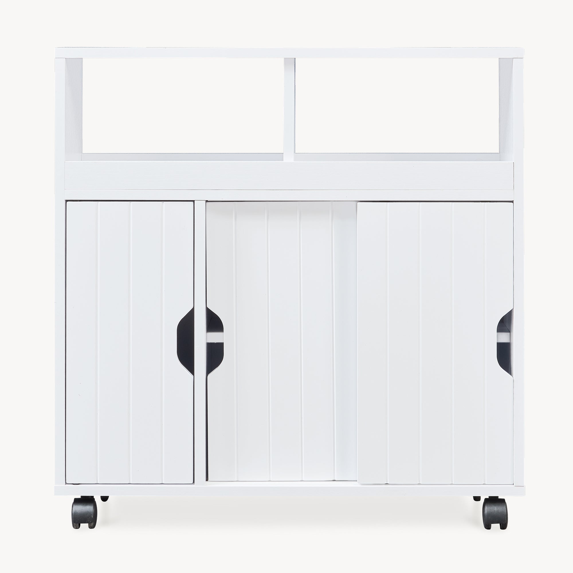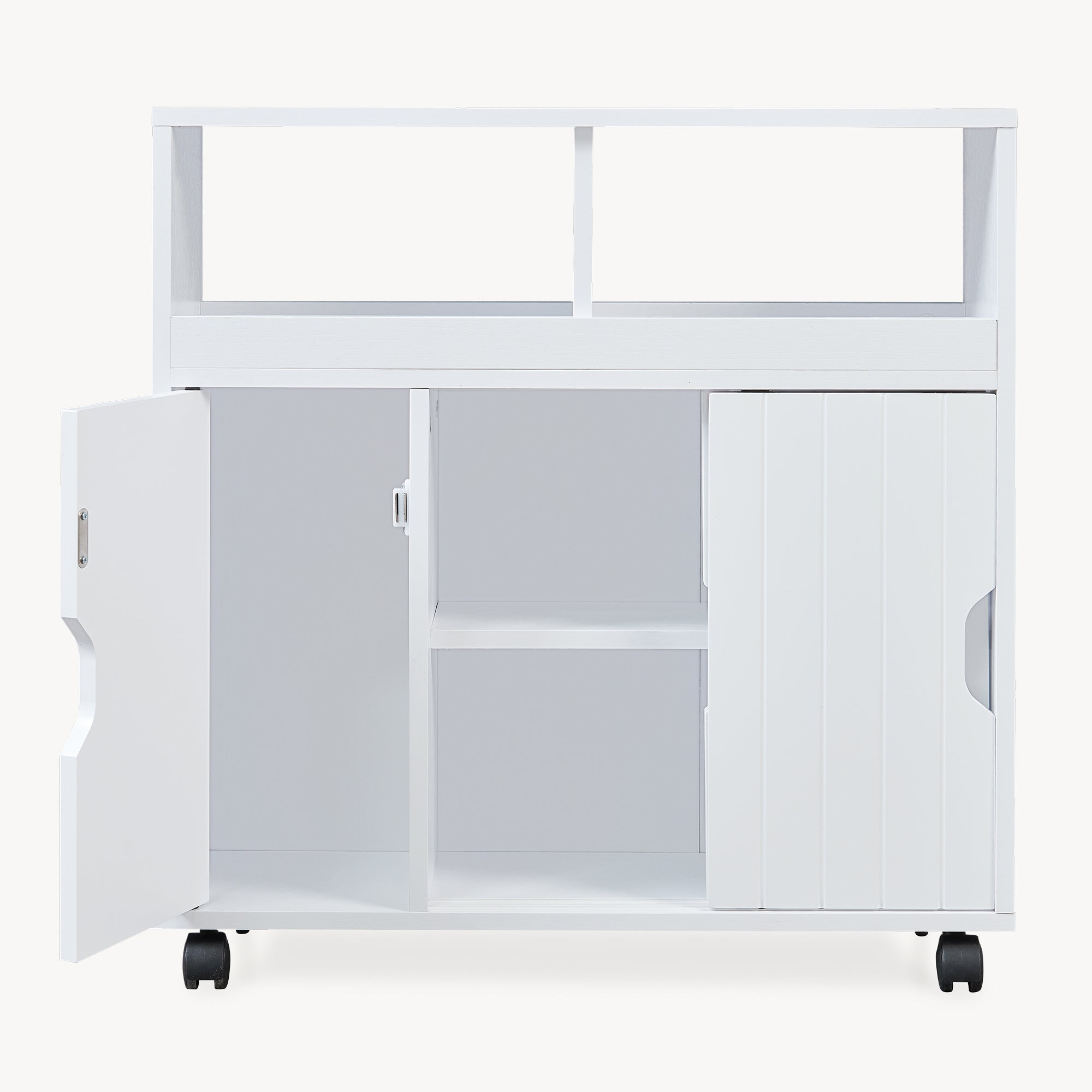 Oben bieten Ihnen zwei offene Ablagefächer schnellen Zugriff auf häufig genutzte Artikel, während darunter eine Tür mit Magnetverschluss sowie zwei Schiebetüren den geschlossenen Bereich ergänzen. Hinter den Schiebetüren befinden sich zwei getrennte Fächer, in denen Sie Vorräte oder Utensilien übersichtlich sortieren.