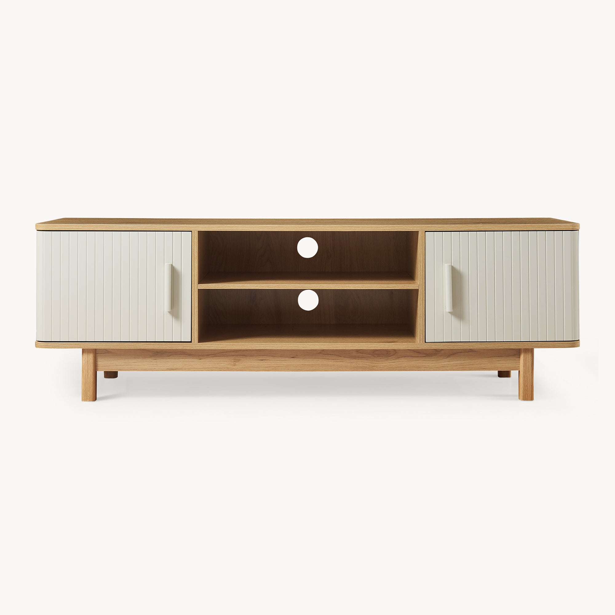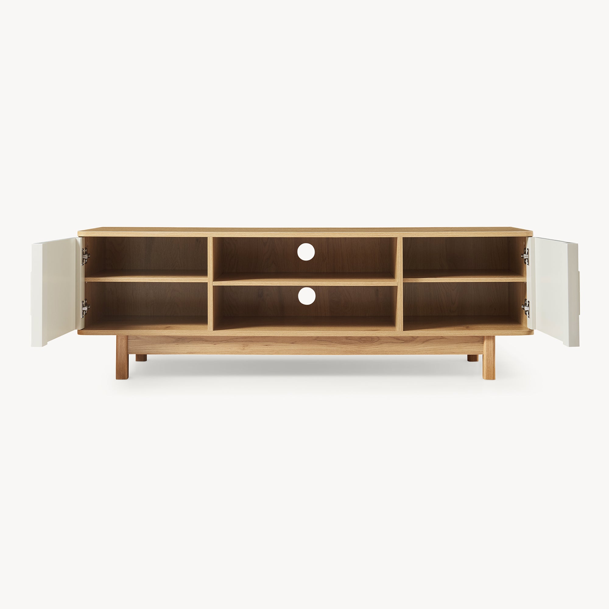 Die großzügige Ablagefläche des Lowboards bietet ausreichend Platz für Ihren Fernseher. Darunter befinden sich zwei offene Fächer, die ideal für die Aufbewahrung von Mediengeräten wie DVD-Playern oder Spielekonsolen sind. Integrierte Kabeldurchlässe auf der Rückseite sorgen für eine ordentliche Kabelführung sowie ein aufgeräumtes Gesamtbild, während alle wichtigen Geräte und Zubehörteile stets zur Hand sind.