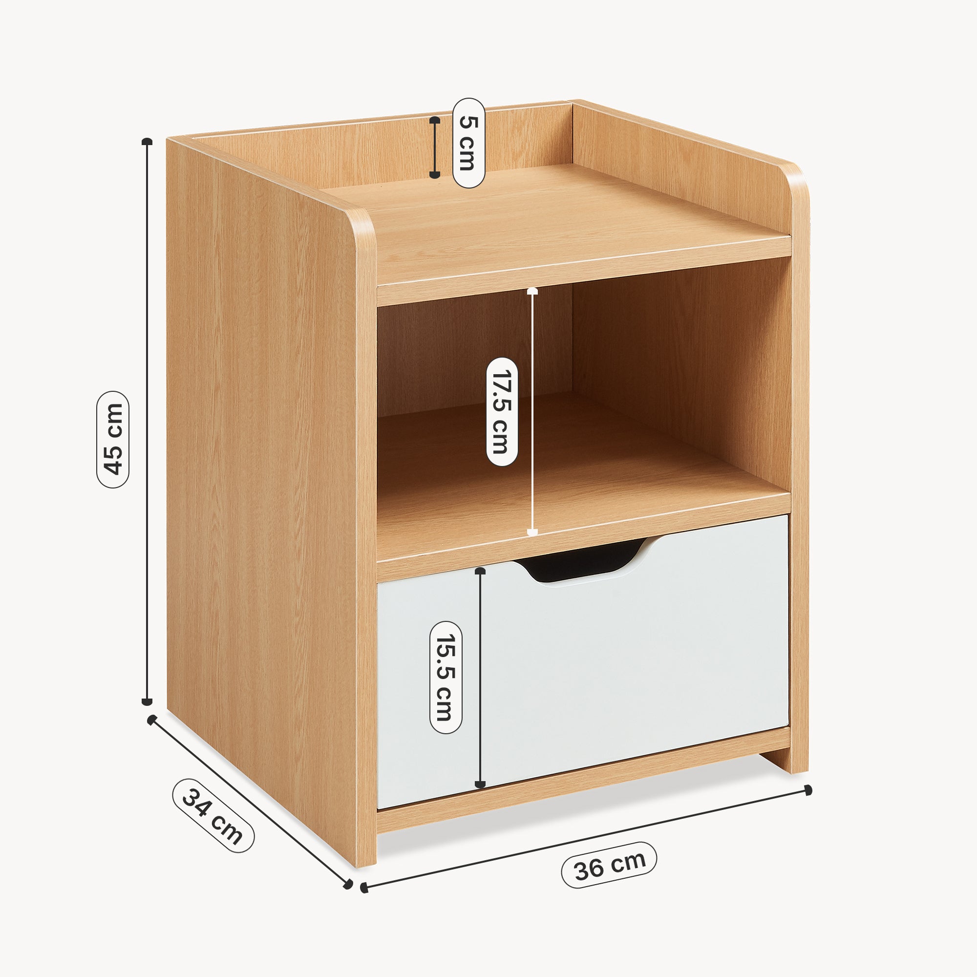 Dank seiner kompakten Größe passt der Nachttisch perfekt neben Ihr Bett. Die robuste Tischplatte bietet ausreichend Platz für eine Lampe, Ihr Smartphone, eine Tasse Tee oder andere Dinge, die Sie gerne in Ihrer Nähe haben möchten. Der erhöhte Rand an den Seiten und hinten verhindert, dass Gegenstände versehentlich herunterfallen.