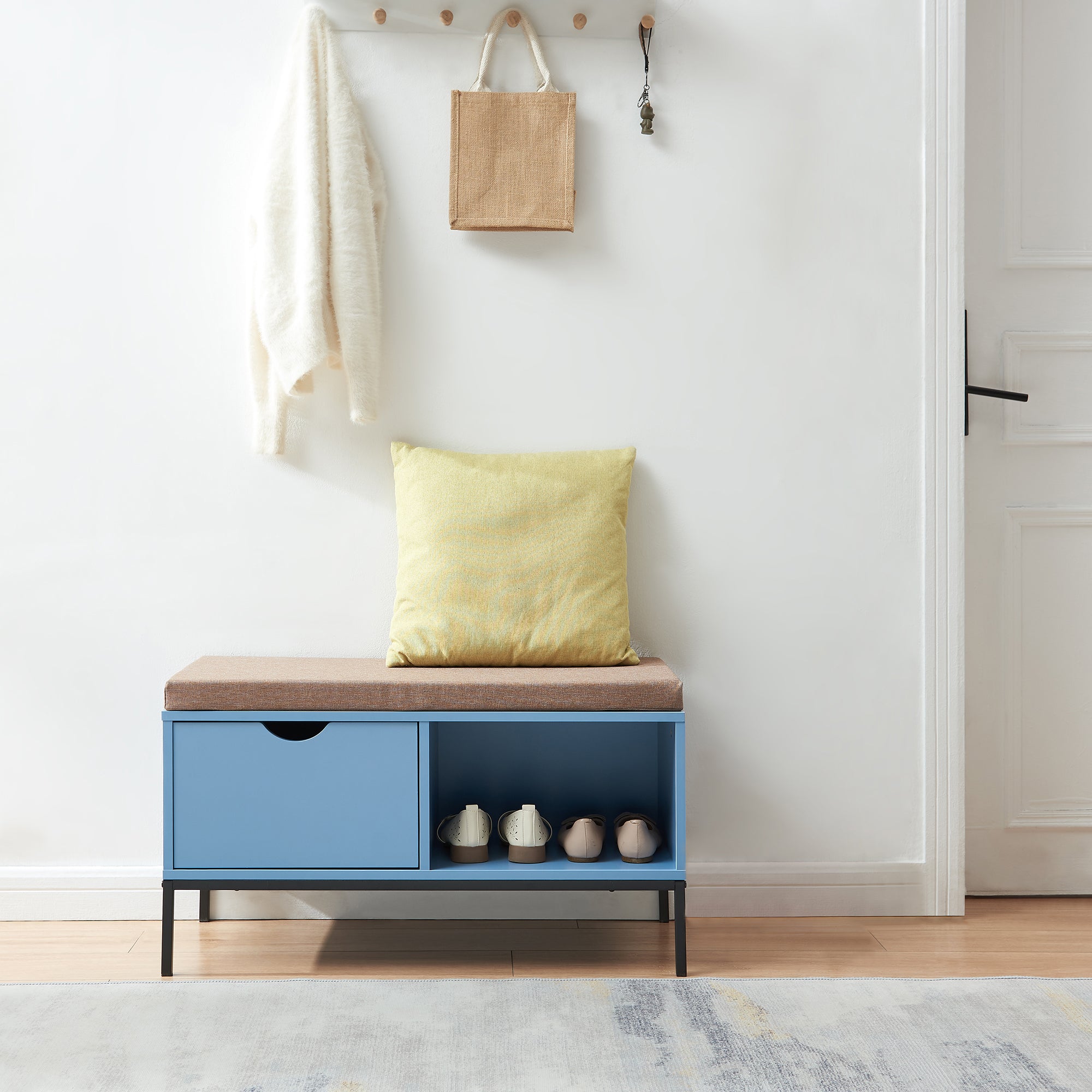 Das Polsterkissen bietet angenehmen Sitzkomfort und macht das Schuhwechseln deutlich entspannter. Gleichzeitig sorgt die stabile Konstruktion für einen sicheren Stand im täglichen Gebrauch.