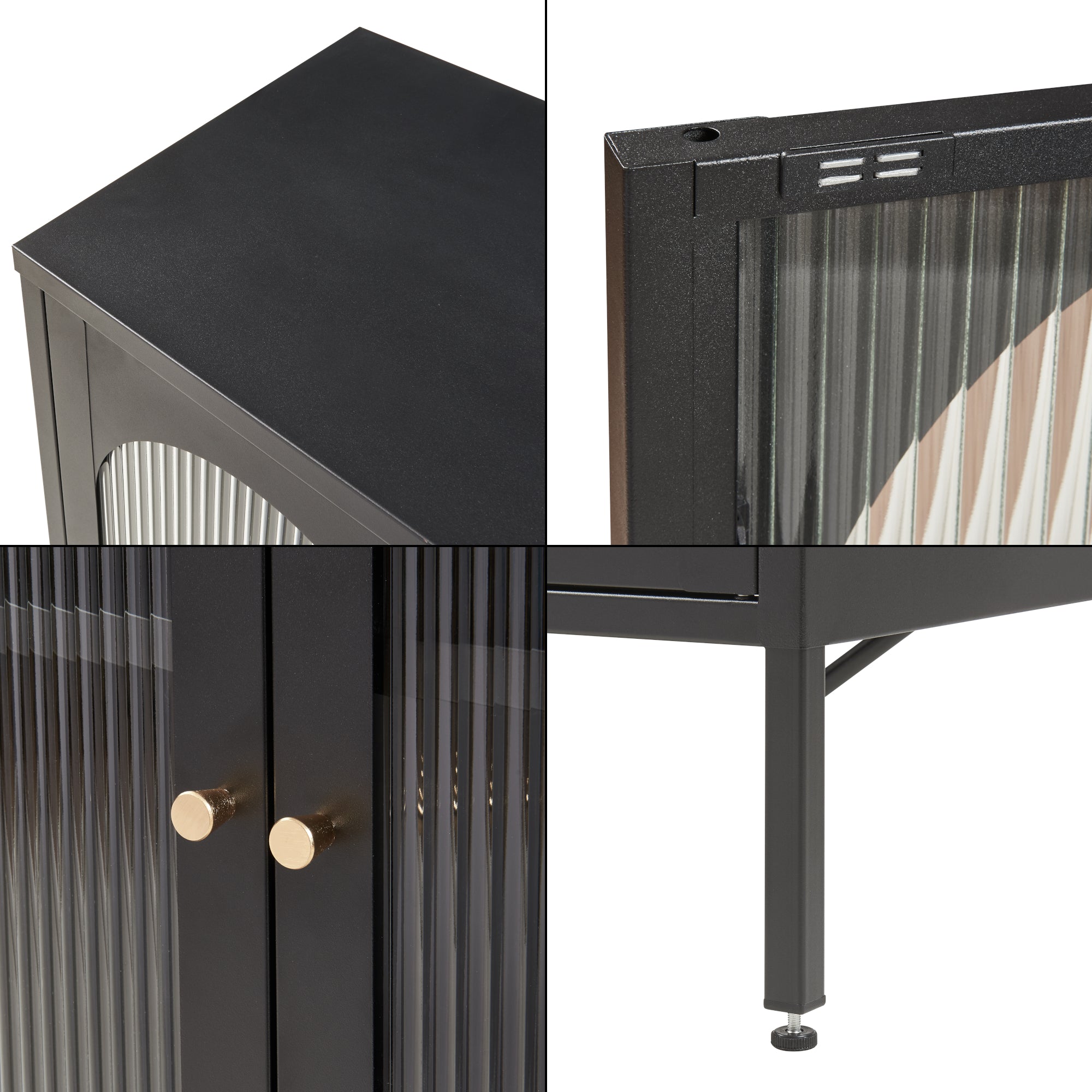 Die beiden Türen aus geriffeltem Glas setzen einen besonderen Akzent und machen das Möbelstück zum Hingucker. Mit den runden Metallgriffen lassen sie sich bequem öffnen und dank Magnetverschluss leise und zuverlässig schließen.