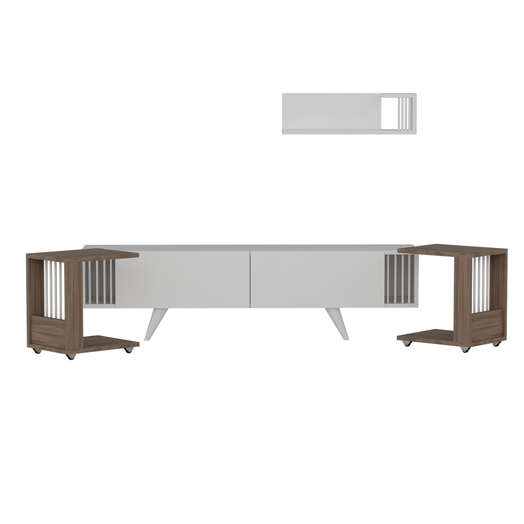 Dieses dekorative und stilvolle Möbelset eignet sich perfekt für jeden Haushalt. Es besteht aus einem Fernsehtisch, zwei rollbaren Beistelltischen und einem Wandregal. Die Nebentische verfügen jeweils über 2 Ablagen. Außerdem lassen sie sich durch ihre praktische Bauform problemlos und platzsparend über das Lowboard schieben.