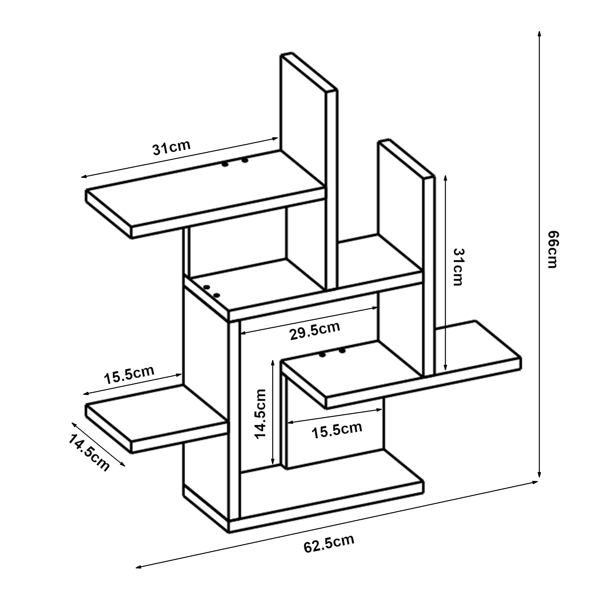 Dieses elegante Regal ist die ideale Ergänzung für jeden Wohnraum und bietet eine praktische Möglichkeit, Ihre Deko, Bücher, Erinnerungsstücke und weitere Objekte stilvoll zu präsentieren und zu organisieren. Es verfügt über insgesamt sieben Ablageflächen, die ausreichend Platz schaffen, um Ihre Gegenstände ordentlich zu verstauen.
