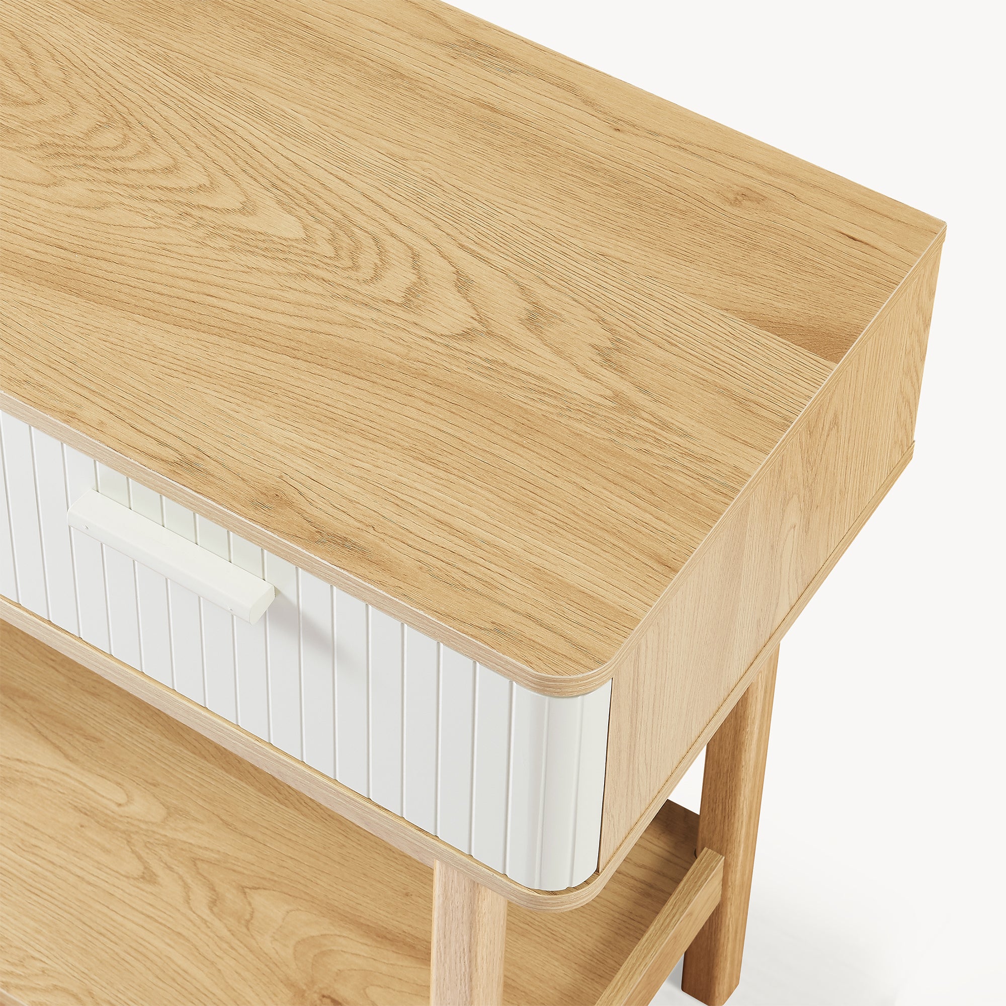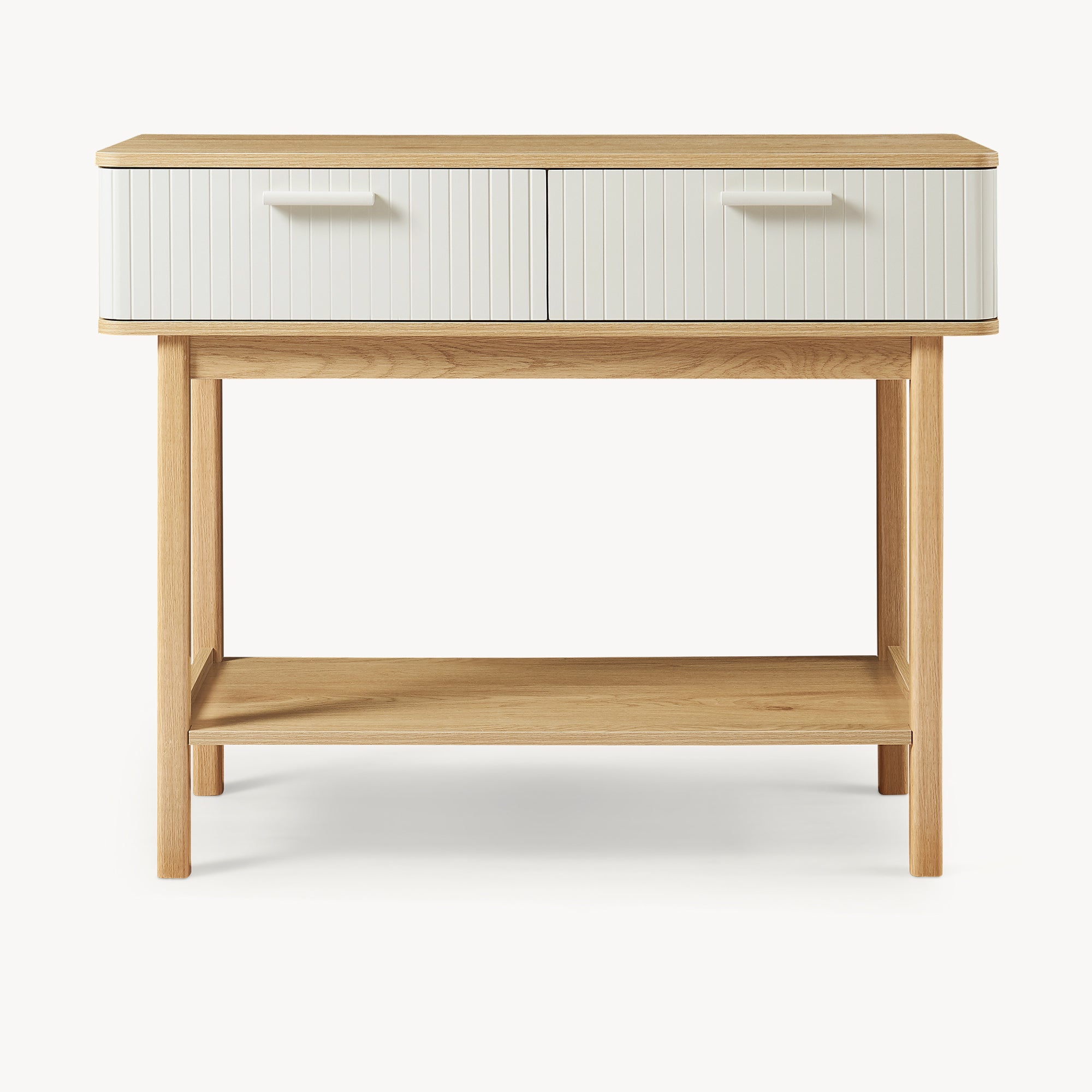 Dieser dekorative und praktische Konsolentisch verfügt über eine großzügige Tischplatte und eignet sich perfekt für jeden Haushalt. Die zwei Schubladen mit geriffelter Front und die untere Ablage bieten zusätzlichen Stauraum.