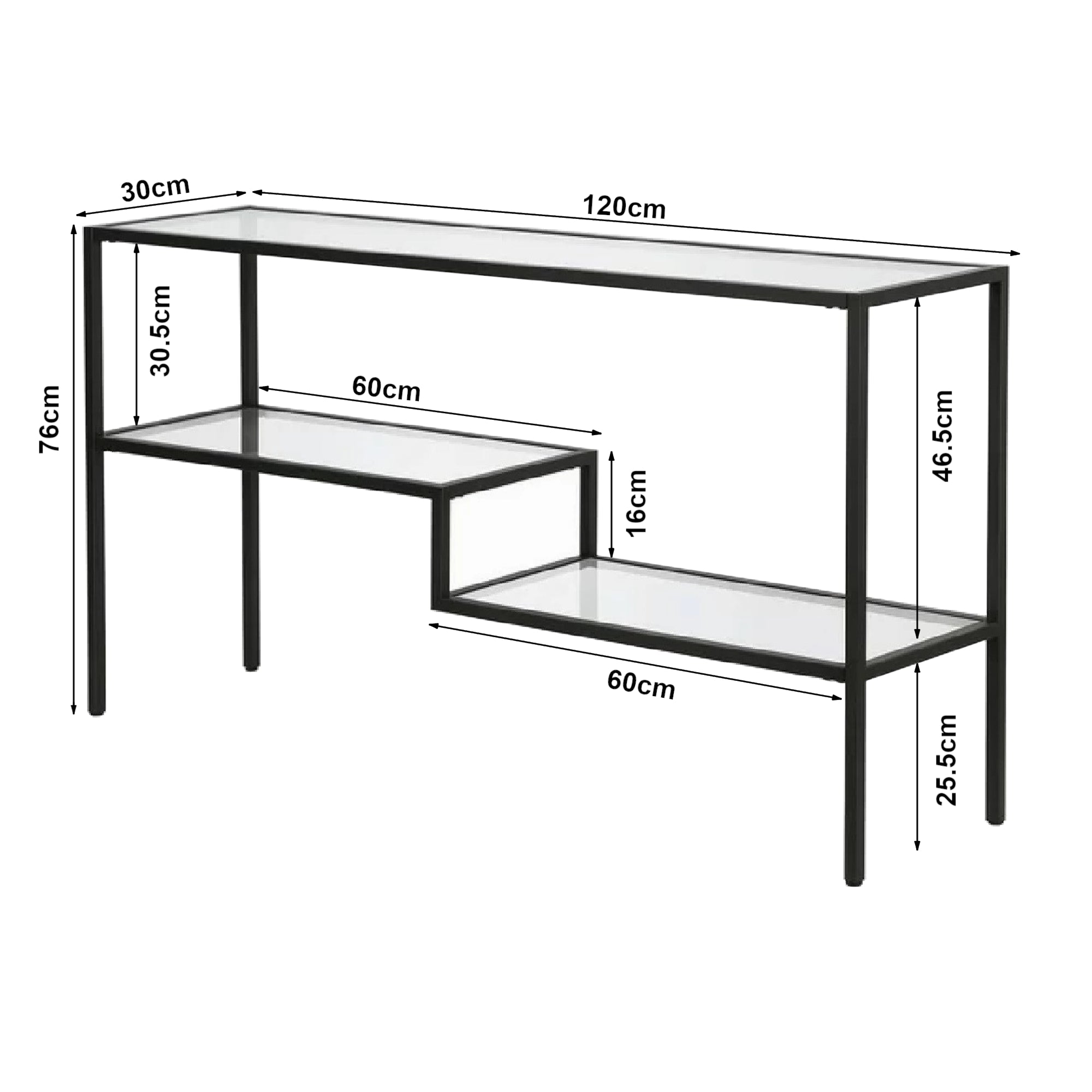 - Abstand zwischen der mittleren Ablage und der Tischplatte: 30,5 cm