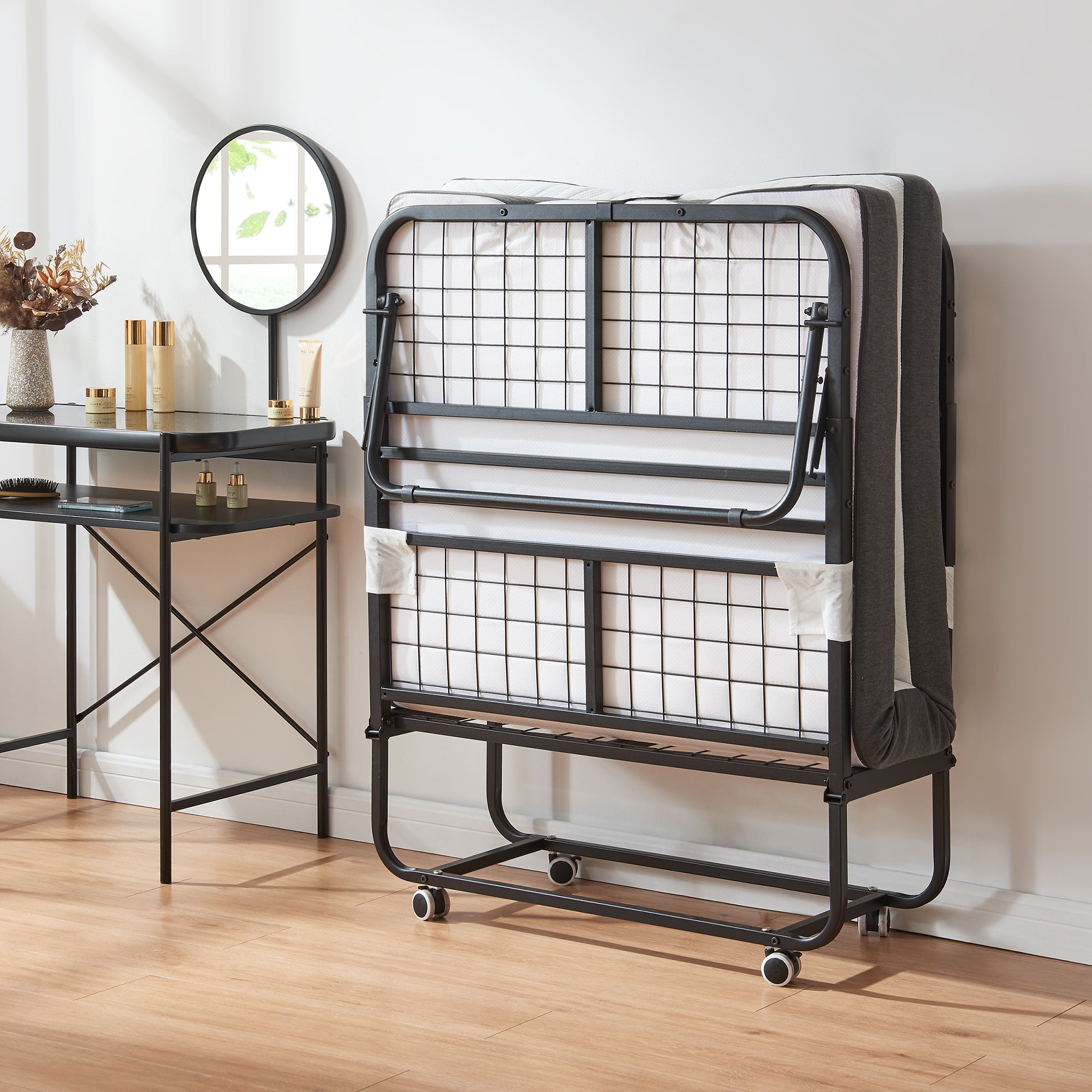 Nach Gebrauch kann das Bett platzsparend zusammengeklappt werden. So lässt es sich problemlos in einer Ecke oder einem Abstellraum verstauen.