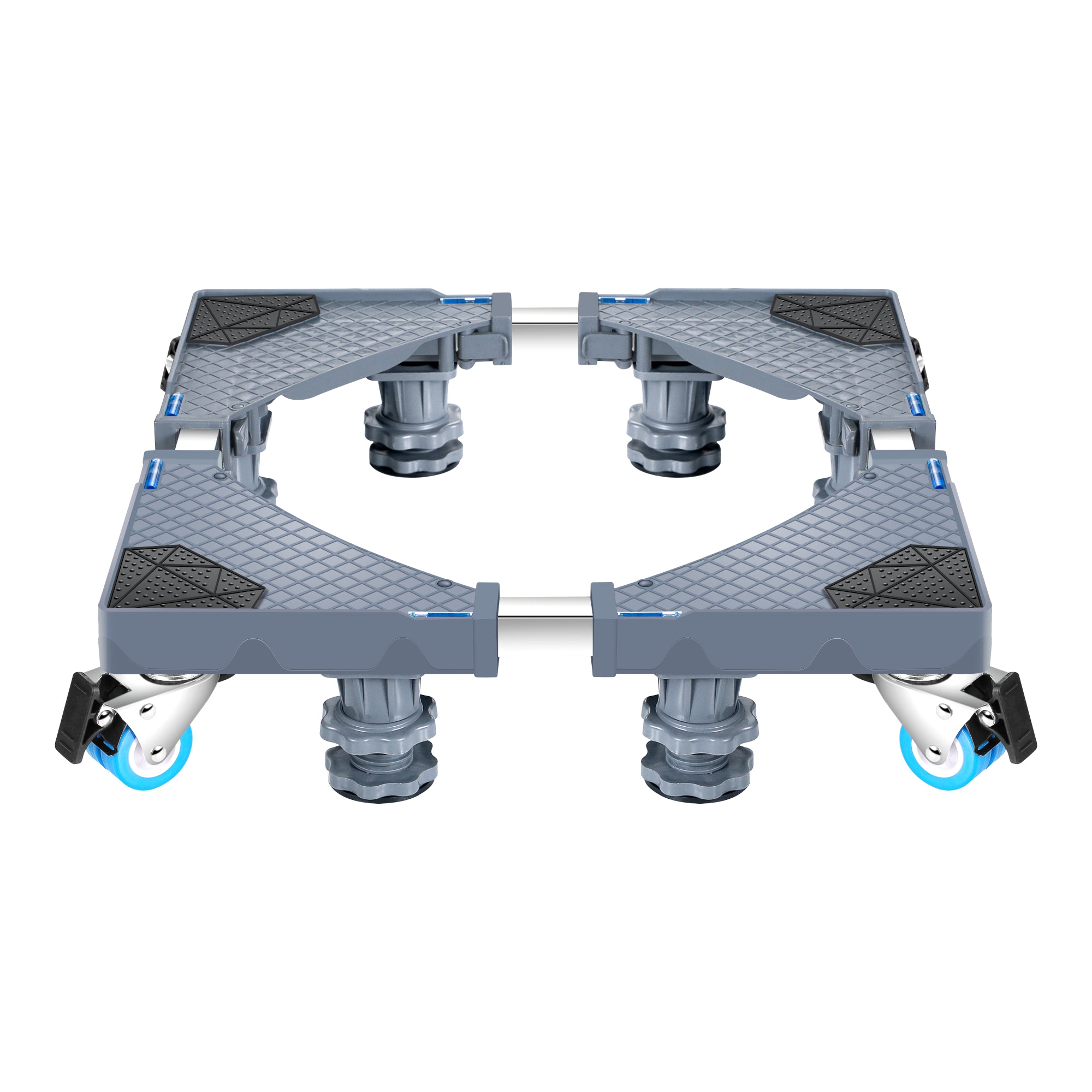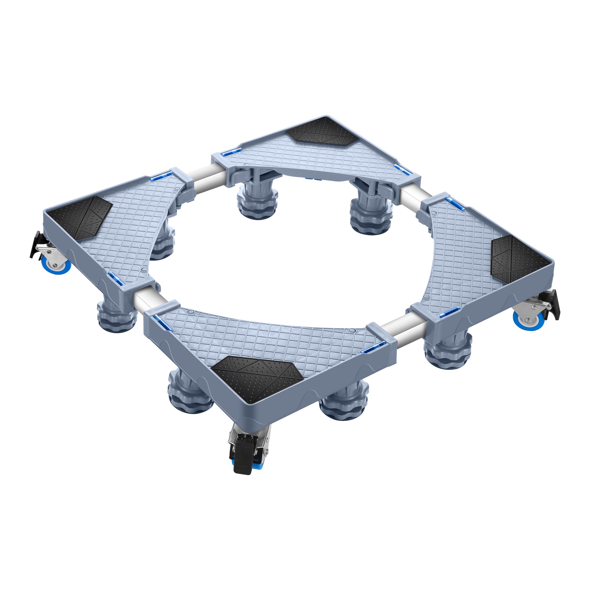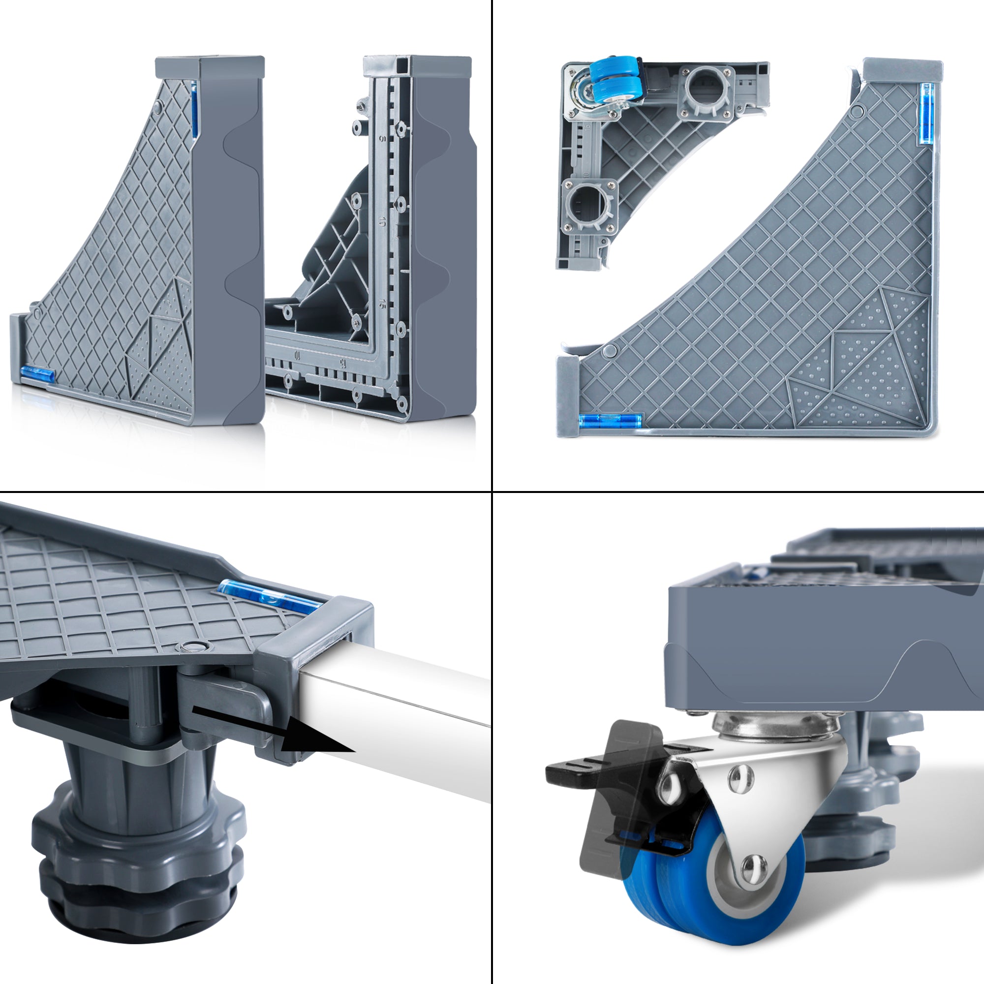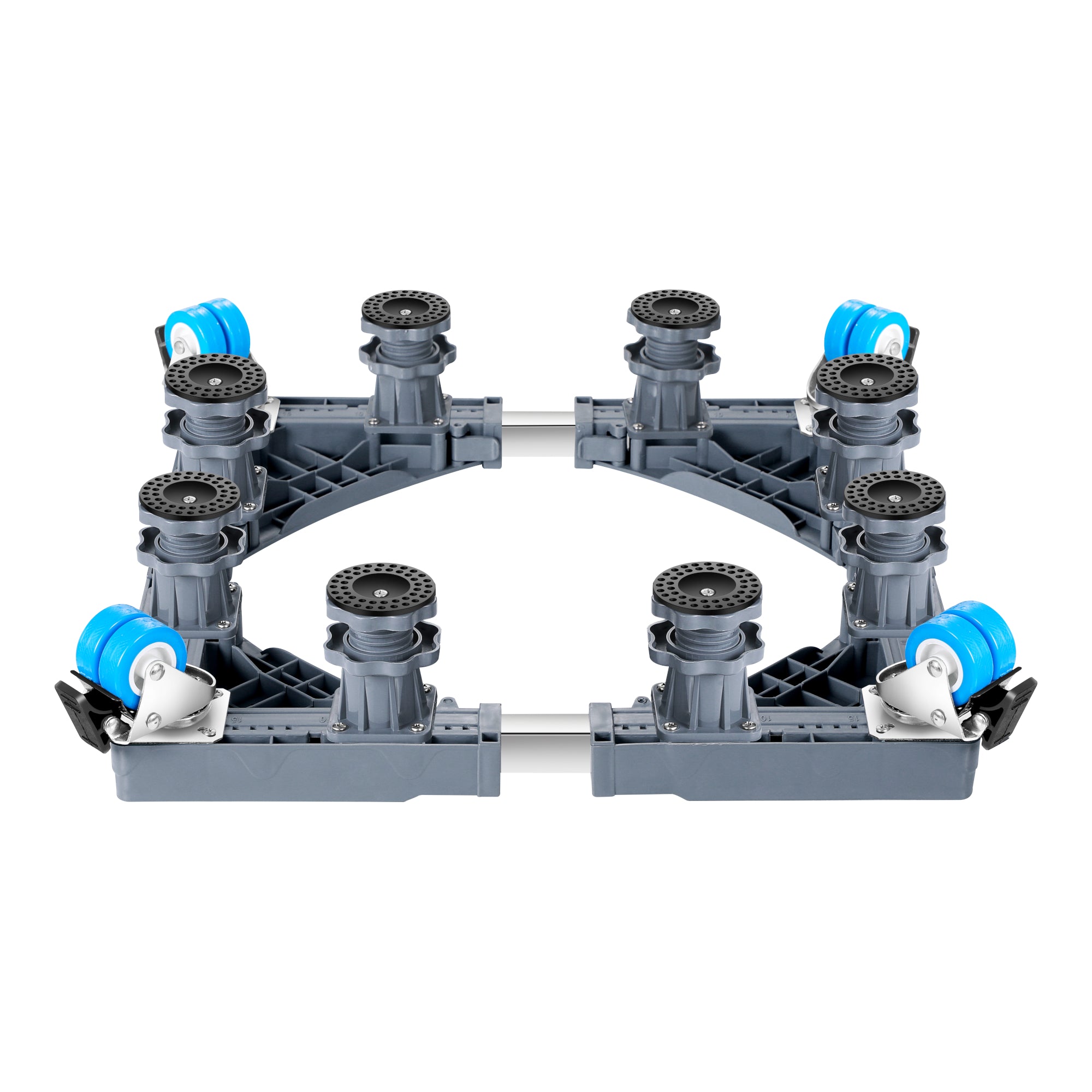 - 4 blockierbare Doppelräder und 8 höhenverstellbare Füße